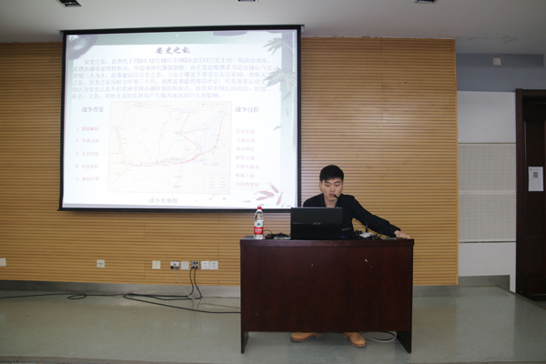 张晨锴同学用自己专业丰富的历史知识从唐朝的发展、人物以及长安的历史演变等方面,向大家详细的讲解了西安的发展之路。在“那年”一环节中,张晨锴同学通过展示幻灯片,从唐朝的建立说起,声情并茂地向大家讲述了贞观之治、开元盛世、安史之乱等大事件及其结果和影响;在“那人”的讲解中,通过图文共赏的形式描述了唐太宗、武则天、杨贵妃、安禄山等历史人物的故事;在“那长安”环节的报告中,张晨锴详细的向大家讲解了西安的发展历史,并用新老照片对比的方式,使在场的每一位同学充分了解了西安现代化的美好发展。整场讲座过程中,还穿插了填空、连线等形式多样的问题互动环节,使讲座充满活跃的气氛。
