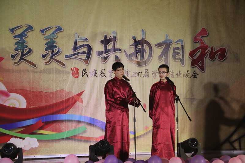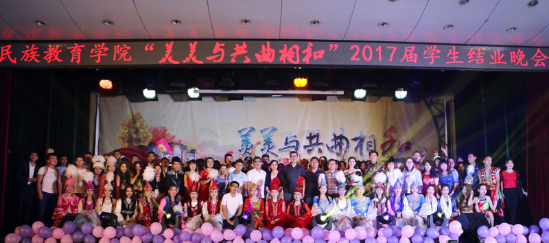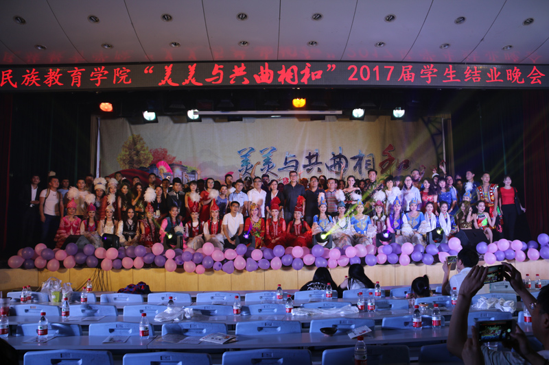 2017届学生结业晚会在少数民族骨干计划研究生劲爆的歌舞表演《flame》中拉开帷幕,晚会分为“各美其美”、“美人之美”、“美美与共”三个篇章进行。舞蹈《萨玛》、《柯尔克孜族女孩》、《黑走马》、《花儿与少年》表现出各少数民族不同的舞蹈风格,同学们用丰富的肢体语言以及他们对自身民族舞蹈情感的处理深深感染了在场的每一位观众。吉他弹唱《爱人的告别》将青春的感恩诠释得到了极致。歌曲串烧《风吹原野,归来少年》,动听的歌声情感充沛,意蕴无穷。劲爆舞蹈《心跳》将拉丁舞与印度舞完美结合,向大家展现了别样的异域风情。预科二班相声《大学那些事儿》、小品《民族根•中华魂》,预科四班表演的情景剧《我在师大“预”见你》,表演生动形象,将大家带入到了昔日开学报到、课堂课下、考试等场景,感染了每一位老师同学,使整场晚会掌声不断。蒙古族学生为大家演绎的歌伴舞《深情草原》充分展示了蒙古族能歌善舞,待客热情大方的情怀,一条洁白的哈达、一杯鲜甜的马奶酒表达的是少数民族学子对学校培育之情的诚挚谢意。学工组7位辅导员为大家带来了精彩歌舞《I LUV IT 》,动感的舞蹈、感人的歌声完美结合,使得晚会呐喊声不断。最后,晚会在各少数民族学生共舞的《民族大联欢》中圆满落下帷幕。