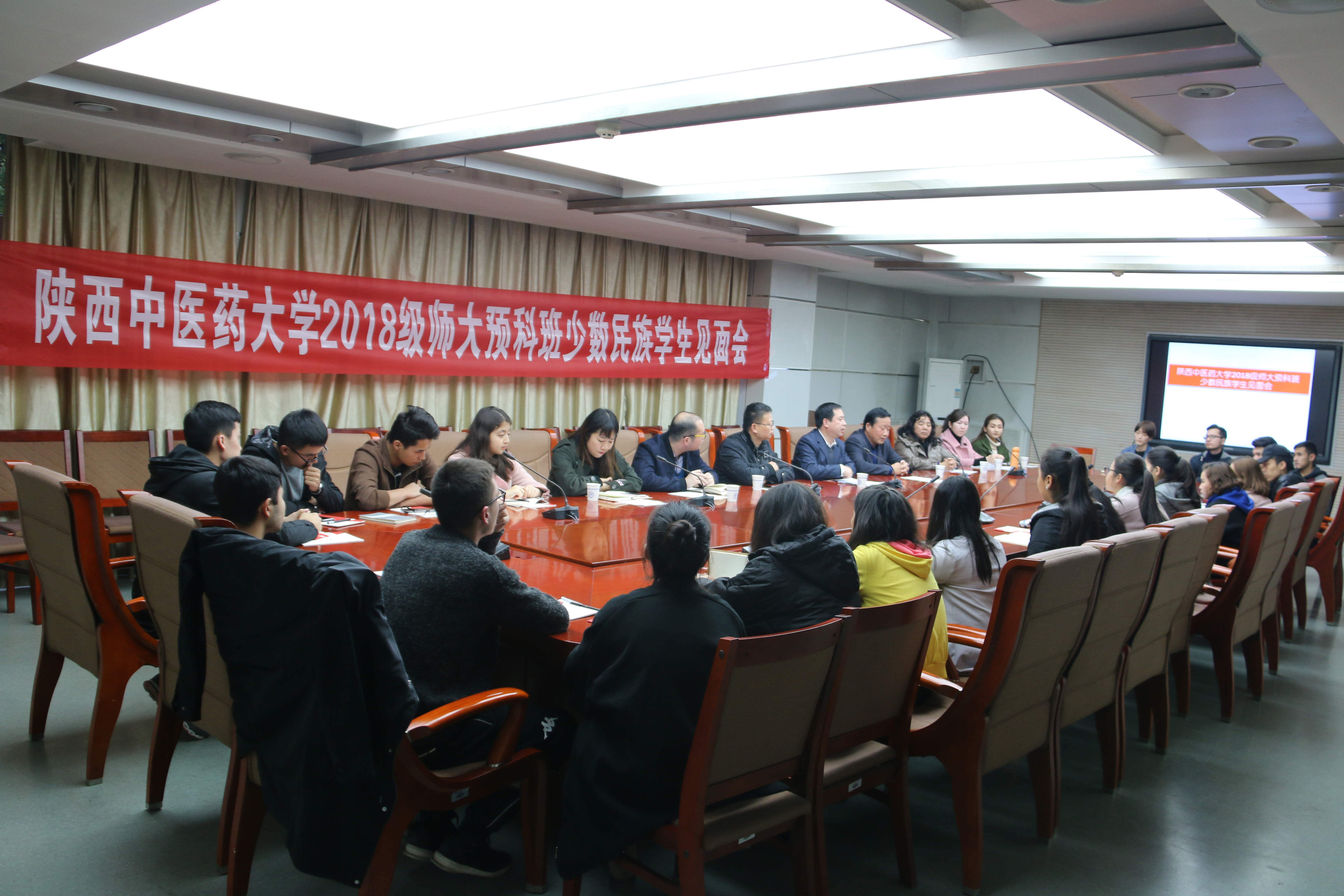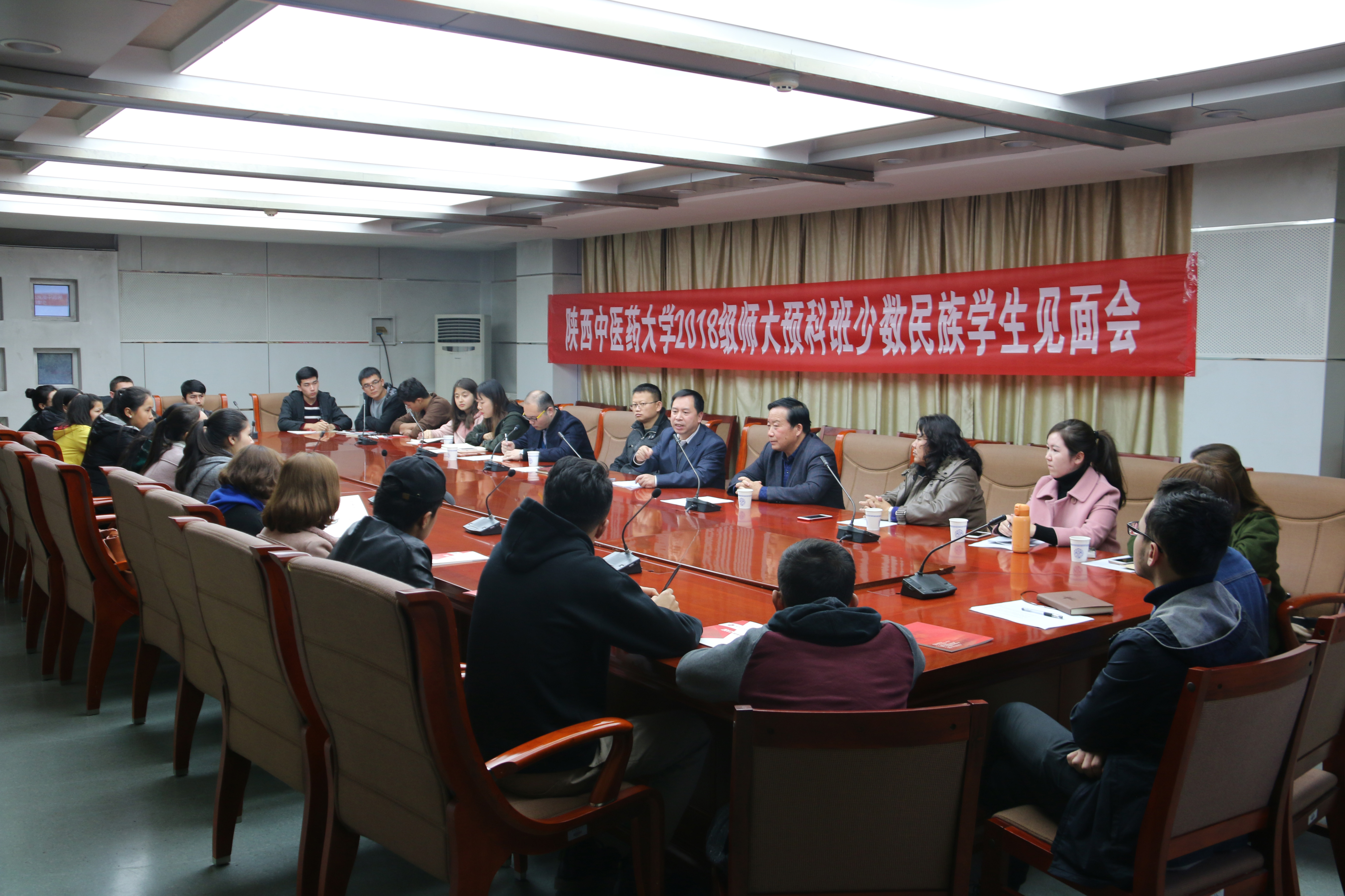 11月15日下午,陕西中医药大学教务处处长杨景锋,学工部副部长杜国辉一行到我院与2018级新疆籍少数民族预科班学生举行见面会。见面会由学工部副部长杜国辉主持。