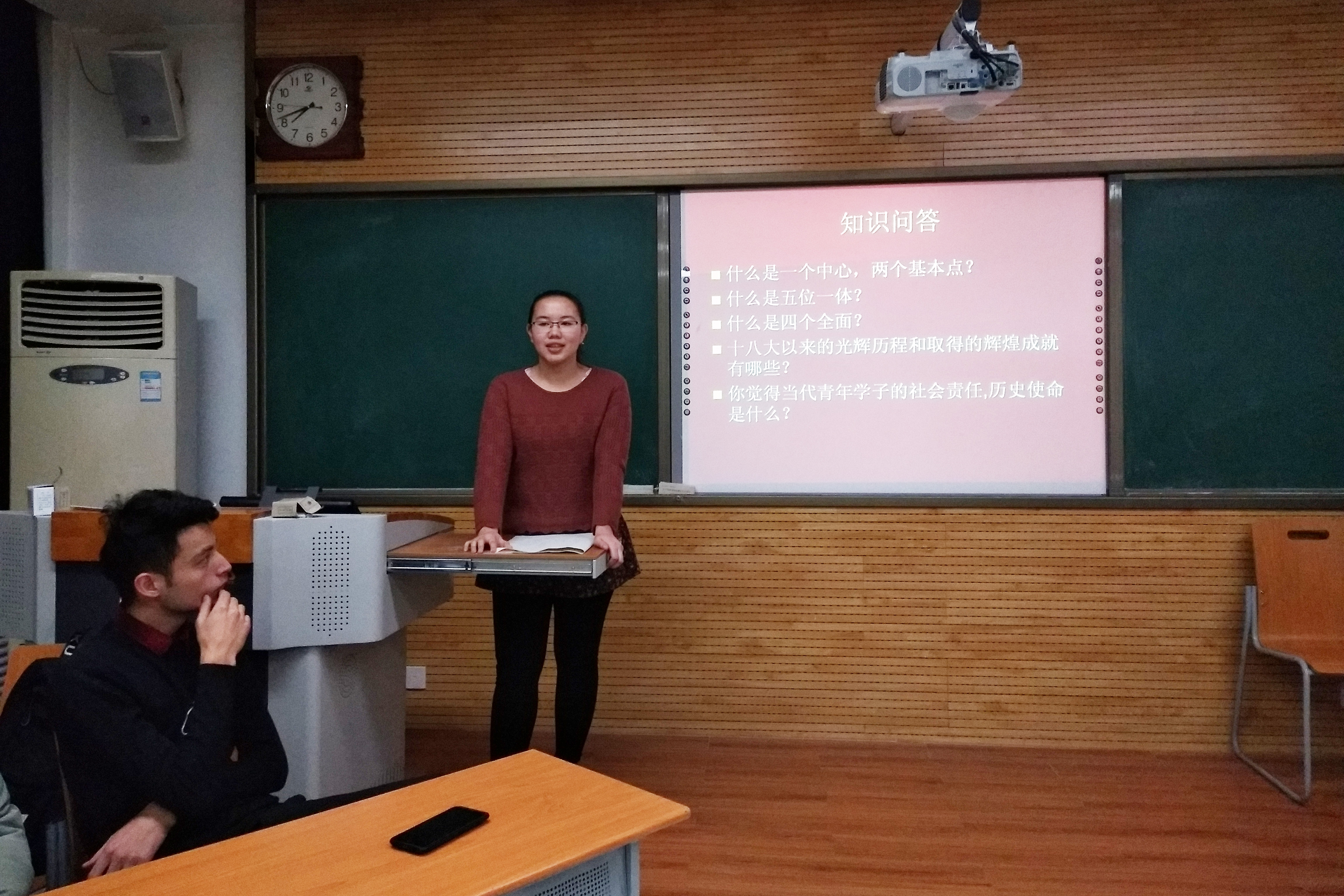 之后,团支书结合十九大的相关知识,组织了“你比我猜”的游戏环节,过程中,团员们积极参与,无论是比划的团员们还是猜的团员们都在活动过程中表现了十足的热情,相信通过这个小小的活动,深化了团员们对学习十九大精神的理解。