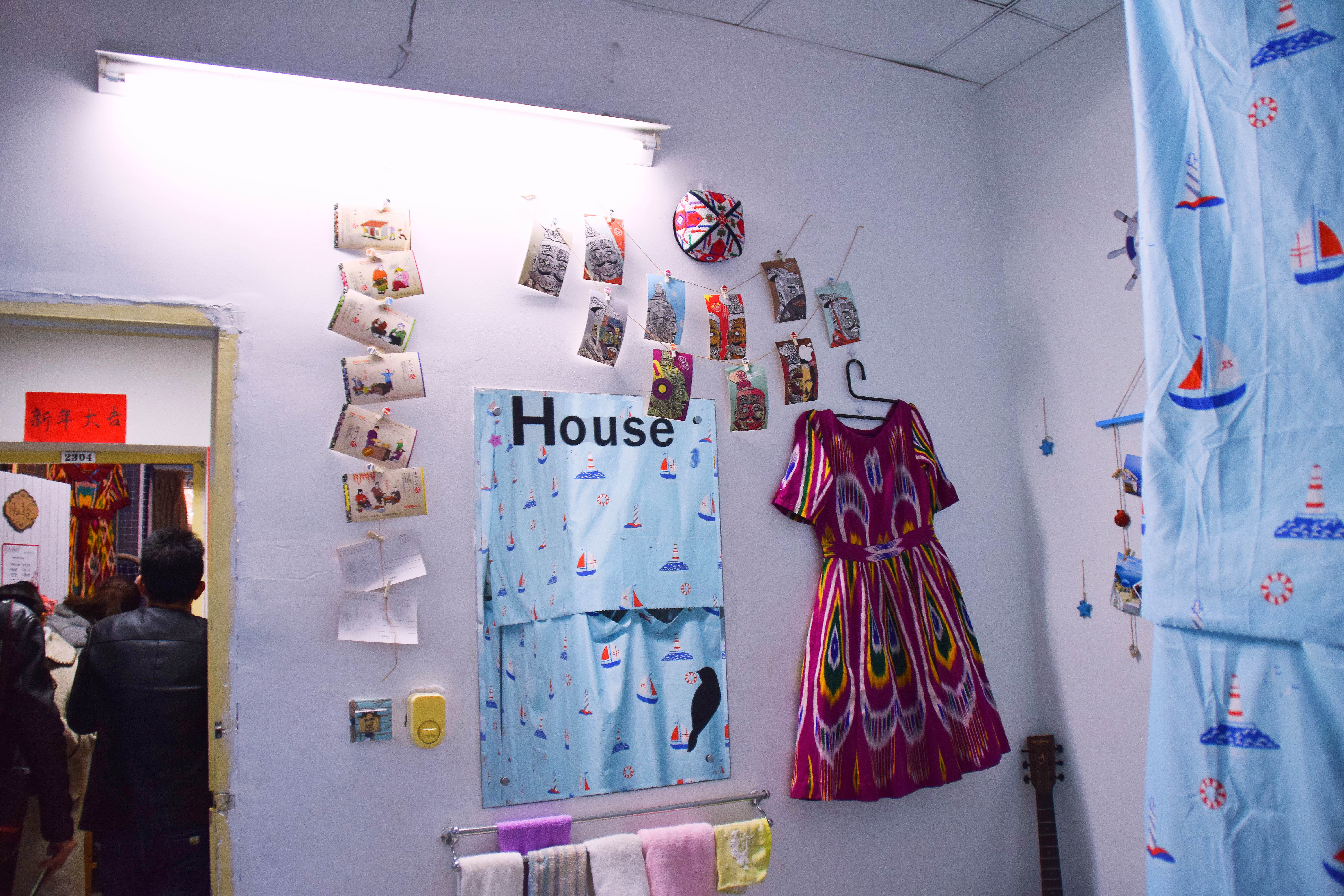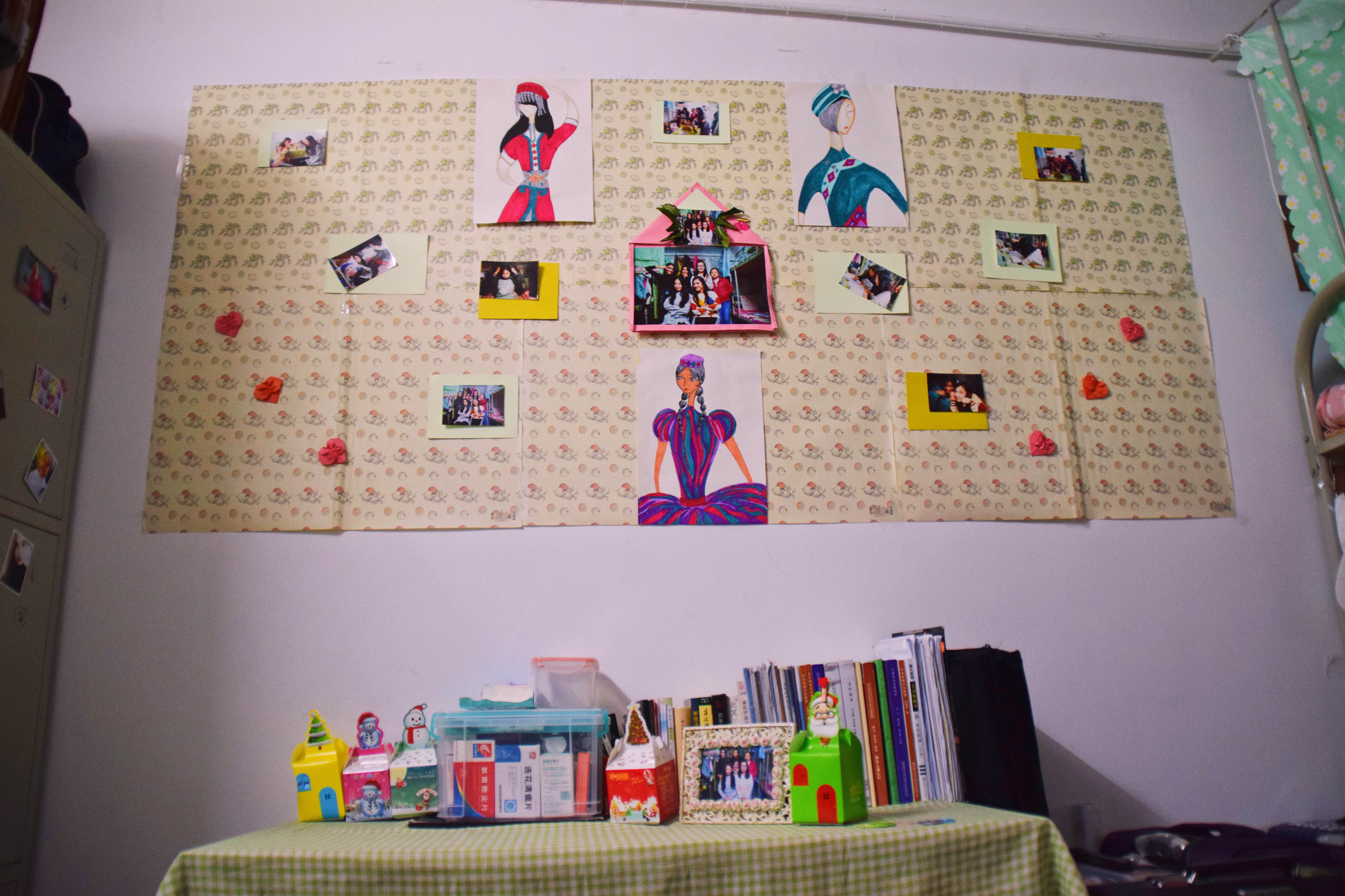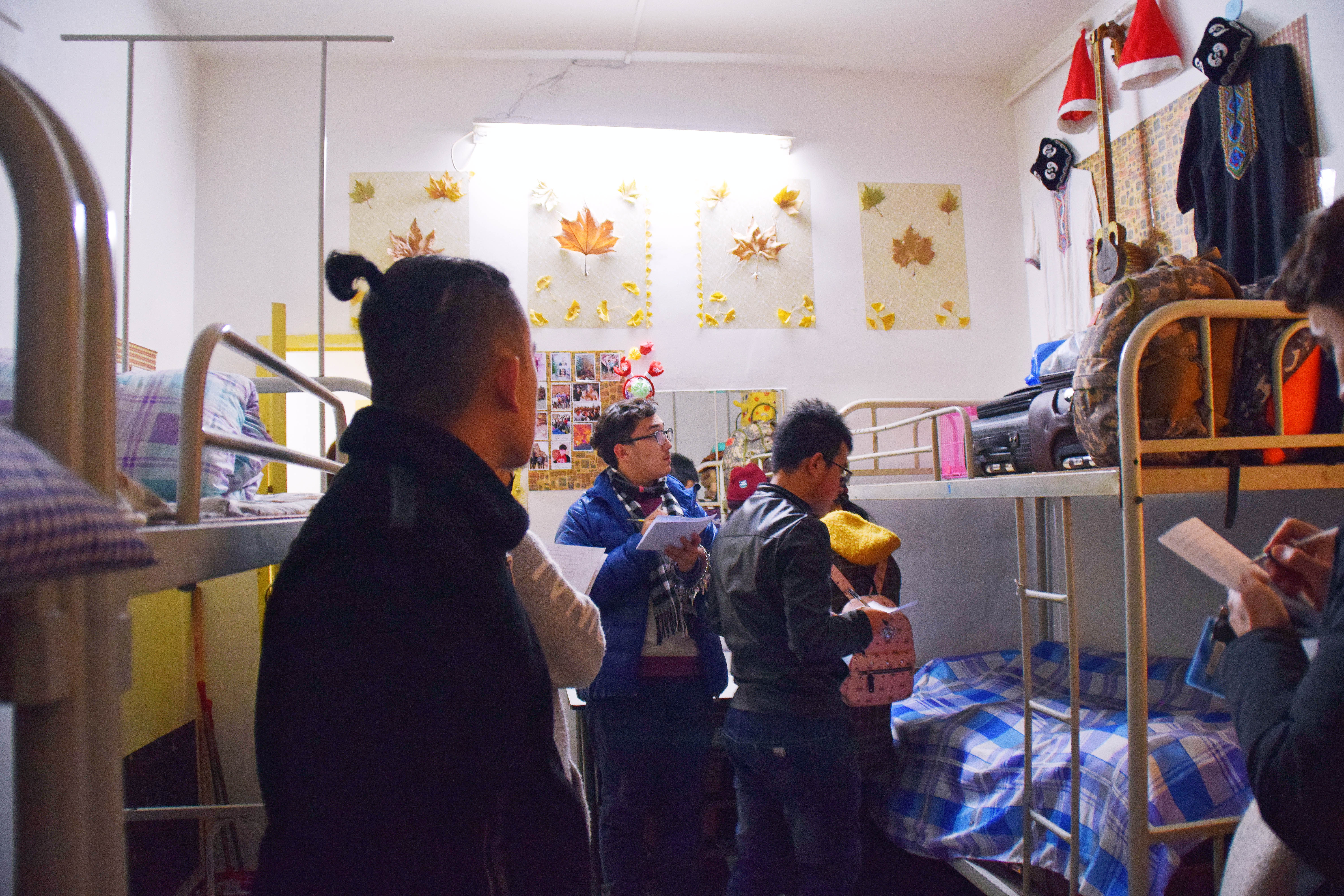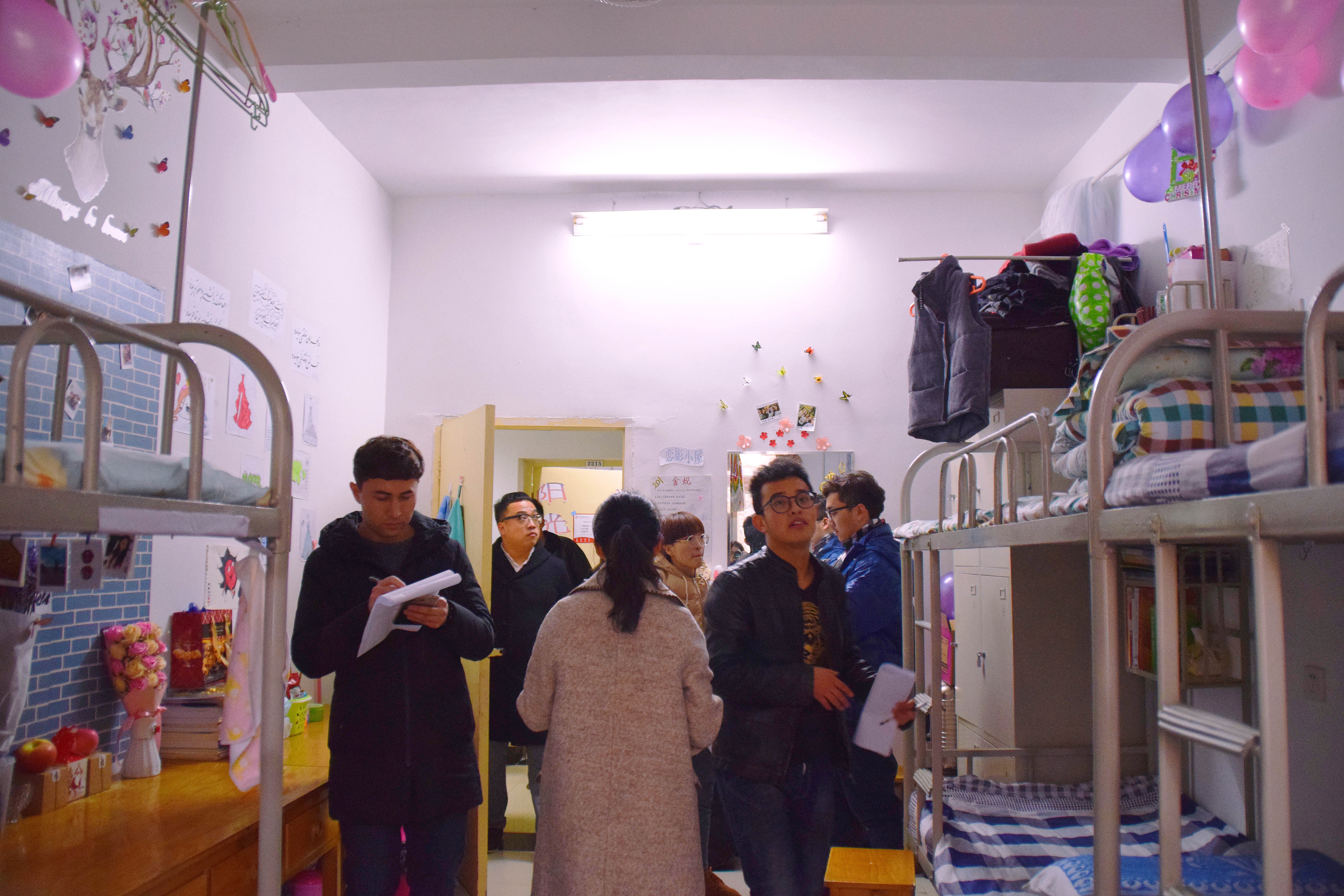 12月25日下午3点,宿舍文化节的评比活动正式开始。老师们及生活部干部先后走访参观了男生4-5号学生宿舍楼和2-3号女生宿舍楼。一进楼道,便能看见走廊上的相框里有学生们青春洋溢的笑脸,一望到小粉楼2栋三楼的走廊尽头,色彩艳丽的民族卡通画象扑入眼帘,那些别出心裁的宿舍主题风格和装扮创意更是令人眼前一亮,这些无一不显示出宿舍文化节浓厚的气氛。还有的宿舍墙上挂着的艾德莱斯绸,铺着民族风花纹桌布的桌子上摆放的馕,墙面上挂着的马头琴,都将民族文化融入生活之中。一些宿舍里挂着同学们手绘的人像画,精美的手工叠纸,得到了各位参审评委老师们的一致称赞。在参观过程中,老师们不仅对同学们参与宿舍文化节的热情表示肯定,同时对大家在宿舍评比中发现的问题提出了指导性的建议。