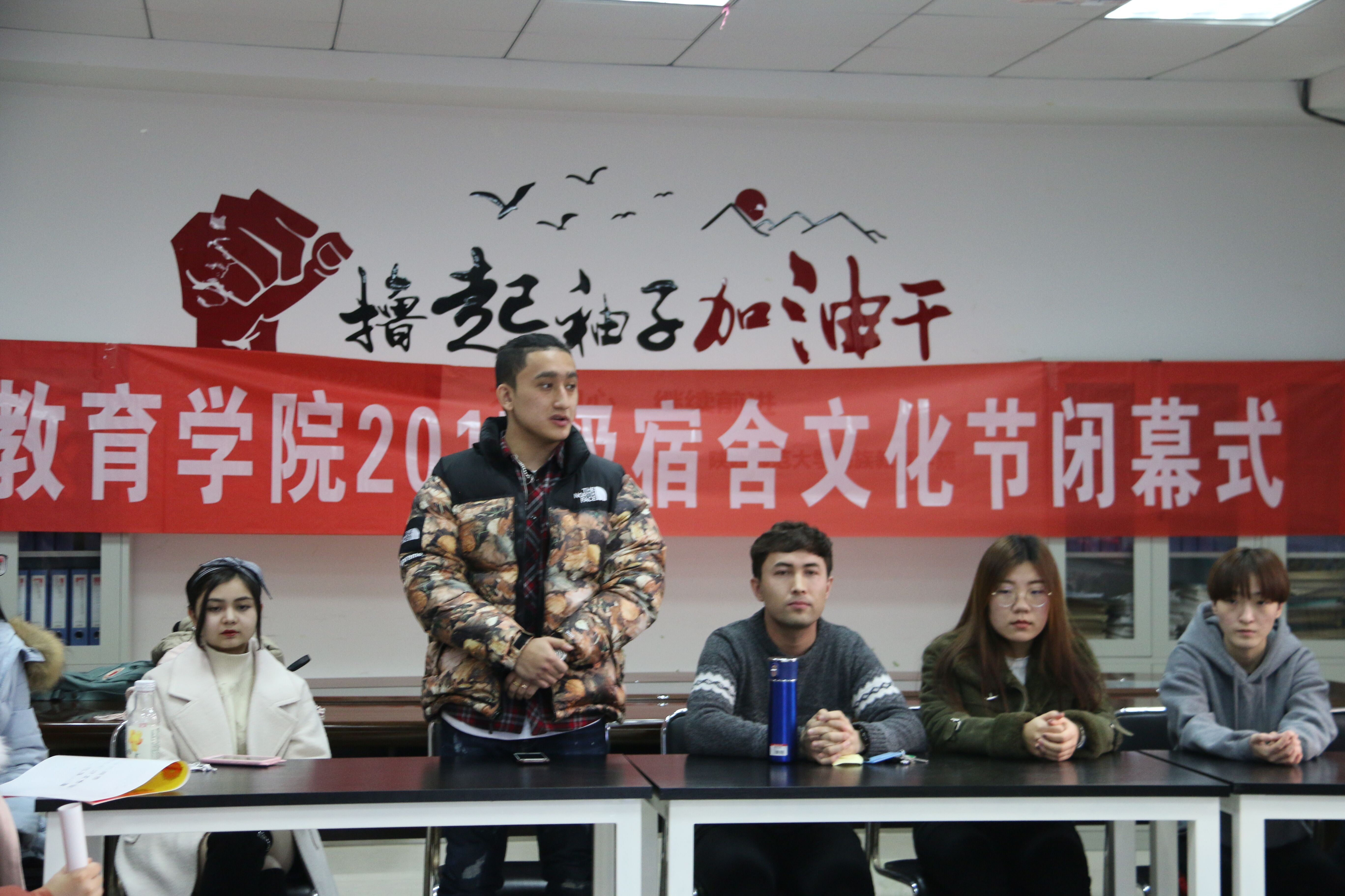 颁奖环节后,学生会主席发言,他说,宿舍就是我们的第二个家,同时对同学们为营造温馨宿舍环境的热情给予赞扬。最后,我院辅导员热依木老师总结讲话,他向组织本次寝室文化节的学生会成员及参加这次文化节的闭幕式的老师和同学们表示由衷地感谢。还表示从这次文化节活动中,他看到了每个人的付出,也看到了同学们展示的各民族的文化以及特色食品,并希望同学生们在今后的学习和校园生活中,要本着“创新、协调、绿色、开放、共享”的发展理念,学习和践行社会主义核心价值观,不断体验和传承中华文化,陶冶情操,塑造灵魂,再接再厉,继续发扬民教院的风采,健康成长成才。