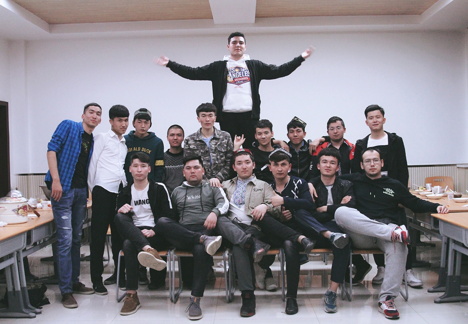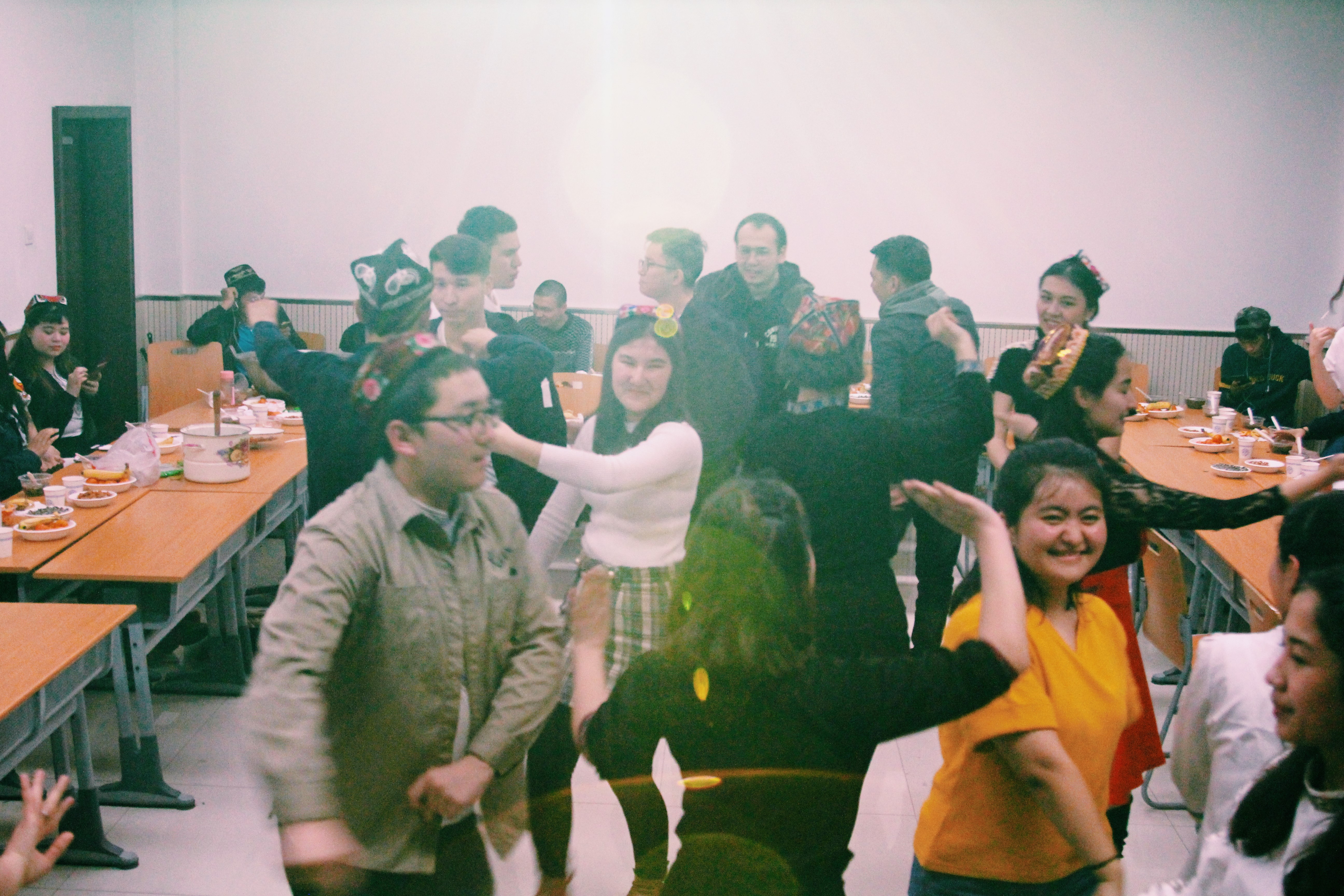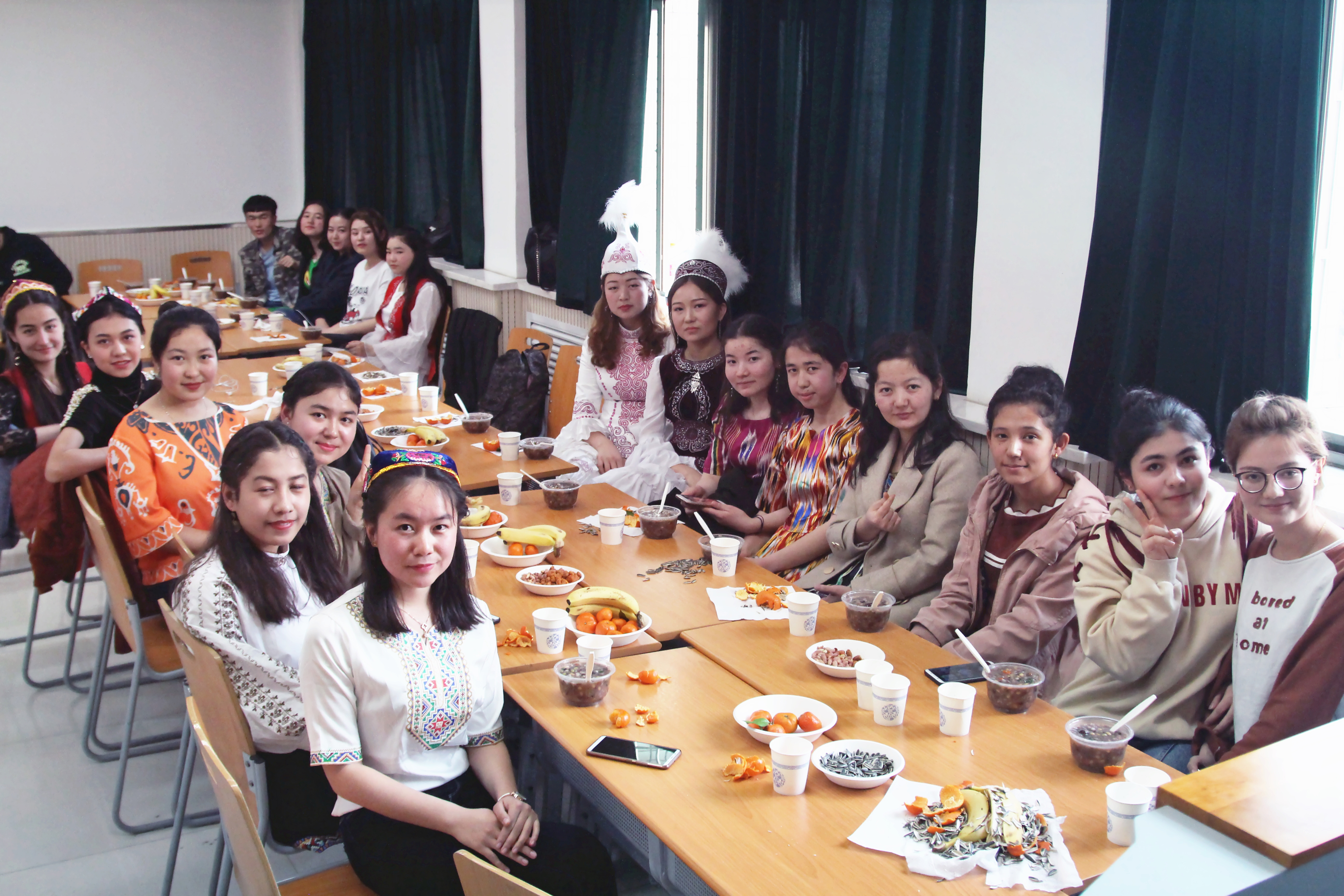 活动伊始,主持人祝大家诺鲁孜节快乐,宣布活动正式开始。在大家的掌声中,音乐声响起,大家陆续开始跳起欢快的舞步,愉快的节日气氛瞬间蔓延整个教室,每个人的脸上都挂着开心的笑容。几场欢悦的舞蹈之后,“诺鲁孜饭”被盛在一个又一个碗里,在同学们手里传递着,在轻快的背景音乐下,同学们开始享受可口的“诺鲁孜饭”。吃过饭后,有趣的游戏环节开始:“抢凳子”游戏引来一阵一阵的哄堂大笑;几位男同学即兴表演的小品更是将热闹的氛围推向高潮;几位女同学甜美的歌声让我们重新认识了她们...接着是一场又一场的舞蹈,维吾尔族同学们的“麦西来甫”,哈萨克同学们的“黑骏马”,同学们完全沉浸在快乐之中,热闹非凡。最后一场舞后,主持人作结束语,她说,这次活动如此顺利热闹的举行,离不开同学们支持与配合,也感谢尽心尽力的班委,她为如此团结的班级而感到骄傲,希望大家以后的每一天都像今天一样快乐,像今天一样团结! 活动结束,同学们聚在一起拍照留念。即使如此,同学们也意犹未尽,热闹的氛围从未平息,欢快的笑声此起彼伏地响起,这样的时刻成为了同学们难忘的预科岁月。