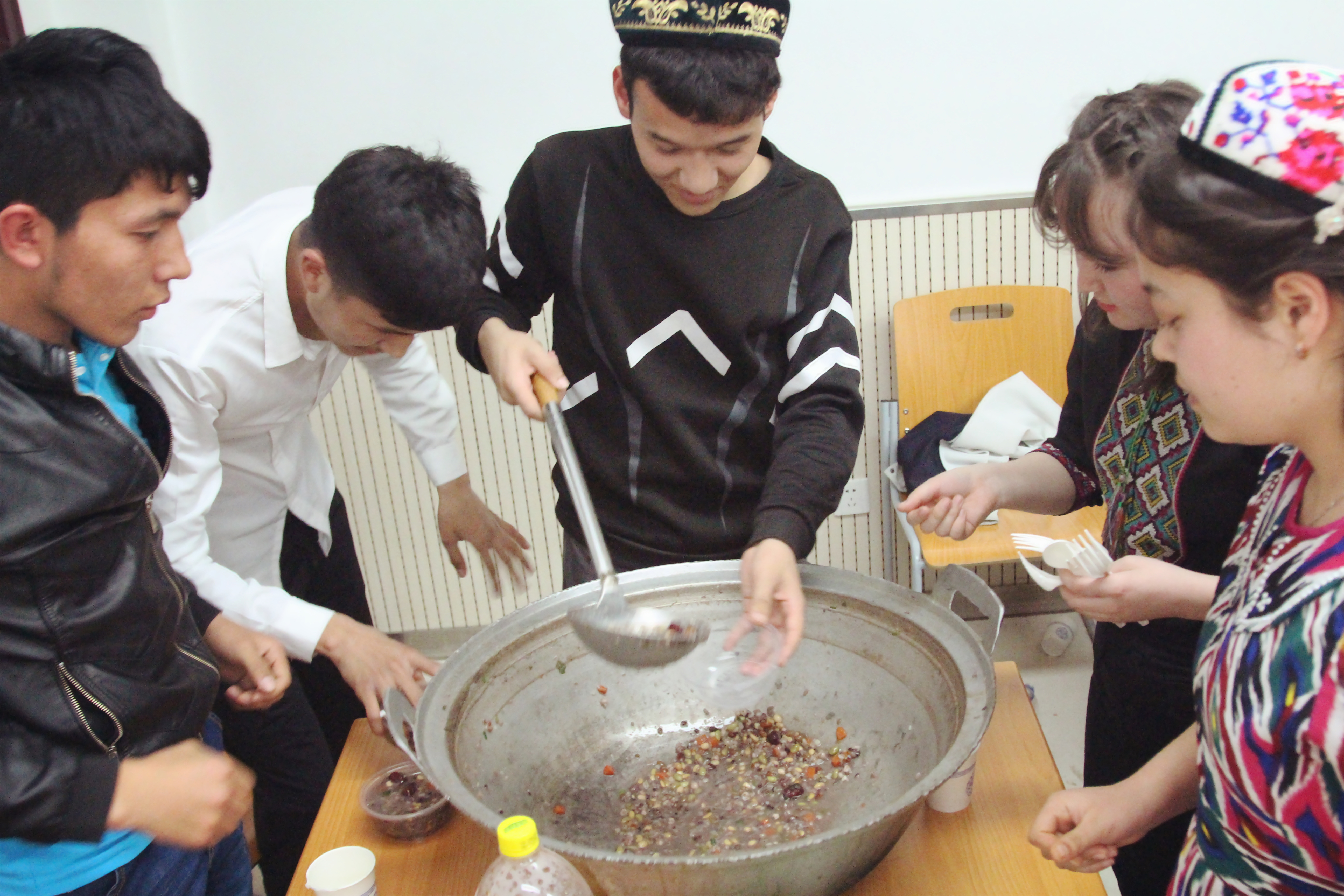 为此,班委十分重视这次的活动准备,并事先准备好了“诺鲁孜饭”。诺鲁孜饭由五谷、羊肉等熬制而成,具有“五谷丰登”的美好期望,是代表性的节日佳肴。同学们穿着具有民族特色的服装,如那句歌词“56个民族56朵花”所说一般绽放,现场极具喜气洋洋的活动氛围,同学们期待满满。