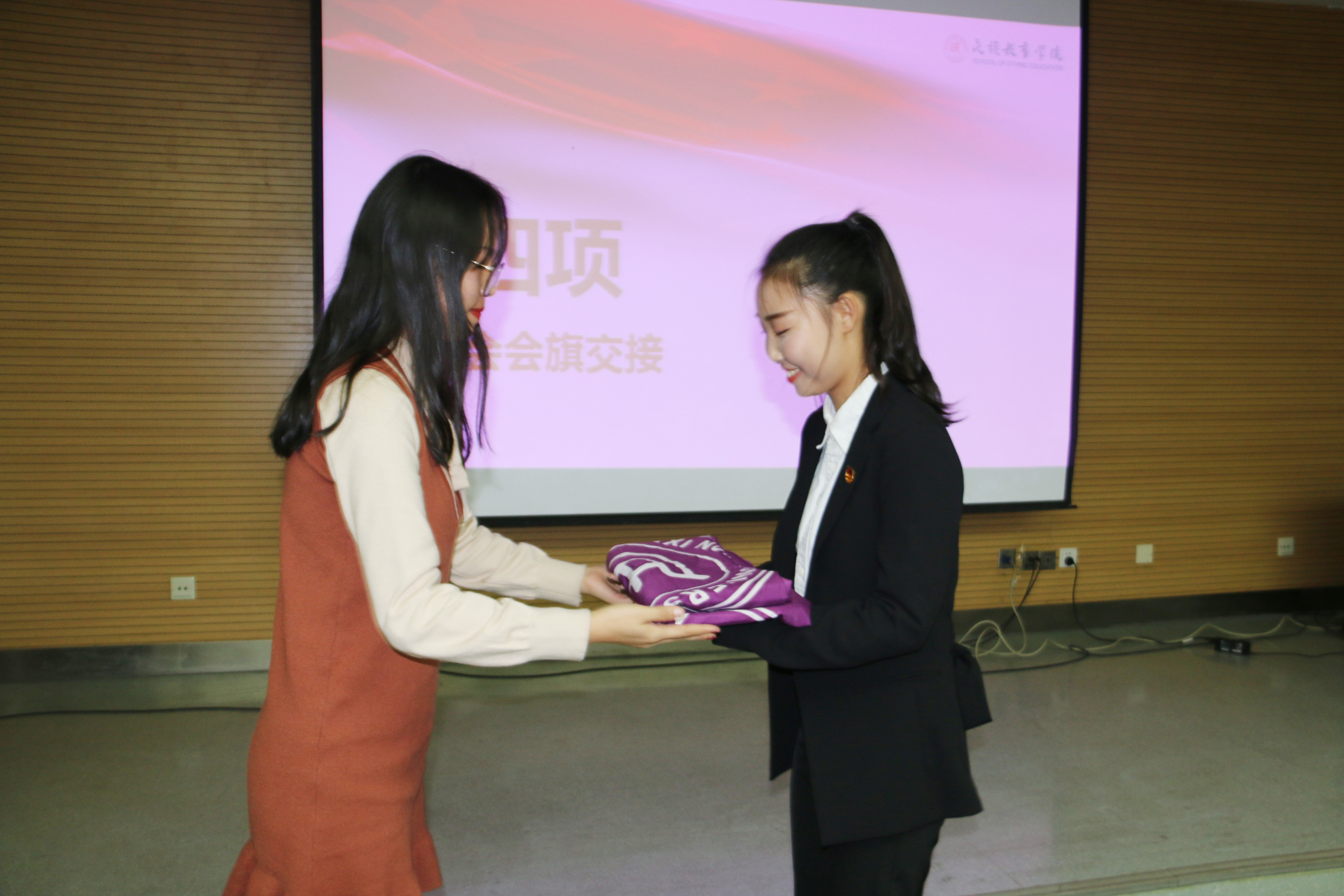上届学院学生会副主席赵宁与新一届学生会主席阿茹罕进行了学生会会旗交接仪式。随后学院上届学生会副主席赵宁同学介绍过去一年学生会工作情况,提出了相关建议,分享了工作感想,并表达了对学院的深厚感情。紧接着新任主席阿茹罕同学发言,首先她非常感谢学院的信任,随后阐述了自己对学生会的认知并提出了几点工作要求,最后对工作做了一些思考,提出了自己的工作设想。