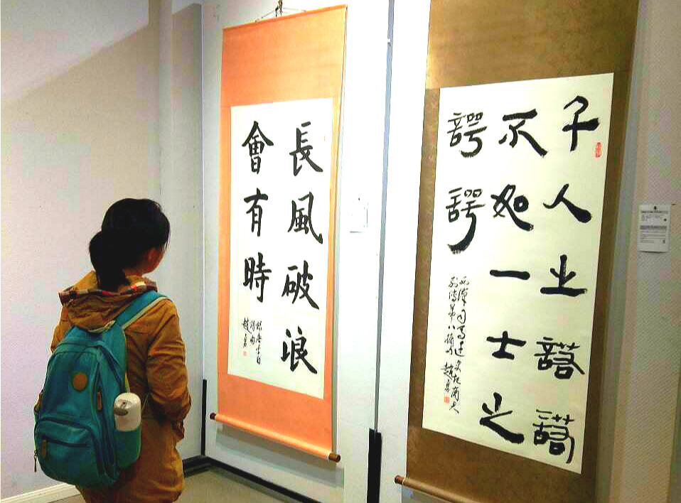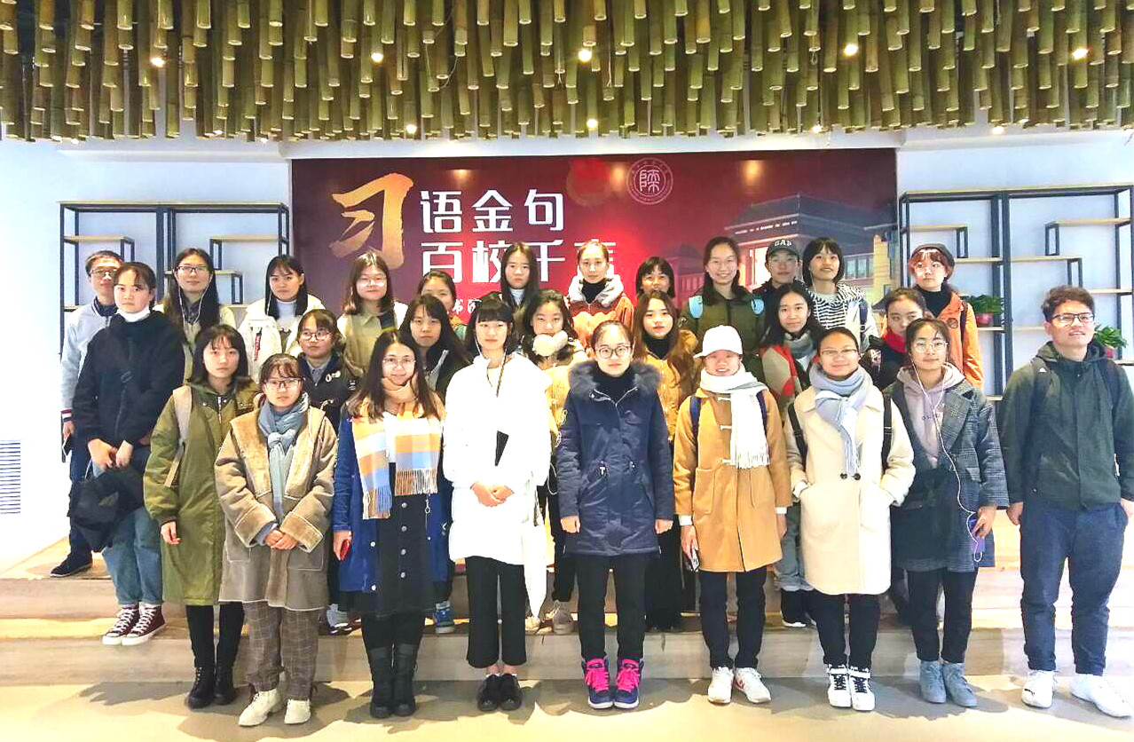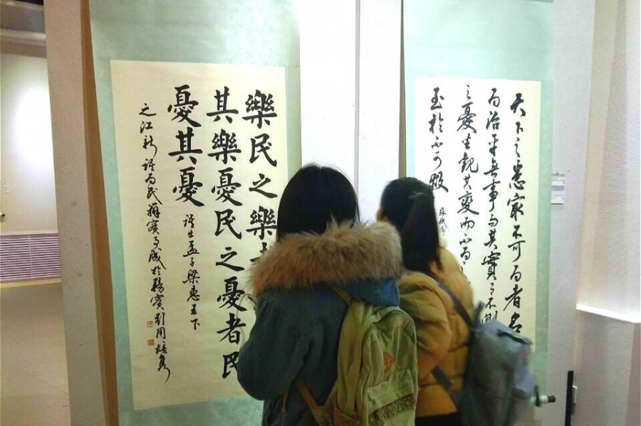 观展活动开始前,马进龙同学就此观展活动意义和目的做了简单的说明,并强调了本次活动的相关注意事宜及安全纪律。展览开始,大家进入展厅自由参观书法作品。在敞亮的大厅里悬挂着一幅幅出自当代名家的书法作品,这些书法名家以不同的字体撰写习近平总书记用典金句50余幅,他们行云流水,笔走龙蛇的作品引起同学们由衷的赞叹,大家纷纷拿出手机,希望可以把这些精美优秀的作品分享给身边人,使更多的人欣赏中华优秀传统文化作品。作品旁边还有小标识贴用中英文两种语言为参观者介绍各种字体特点、历史渊源、以及习近平总书记用典金句的出处和相关背景知识,使得大家在欣赏书法的同时也了解到了金句的背景知识和内涵。最后,大家在展厅中心合影留念,为此次观展活动画上完美句号。