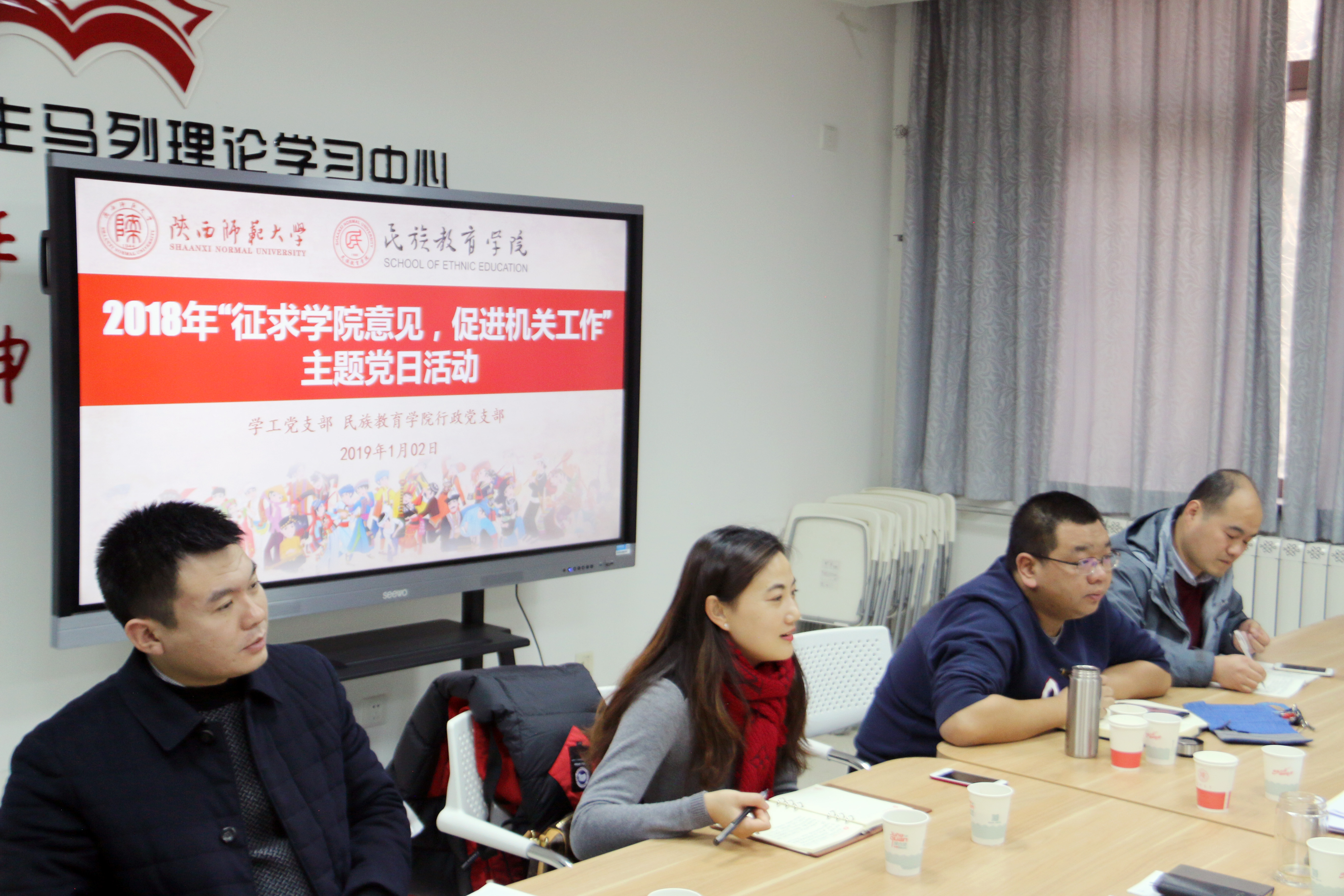 支部结对共建工作,共同促进我校机关工作、为更好的服务在校师生,1月2日下午,我院与党委学工部(学生处)学工党支部开展了“征求学院意见、促进机关工作”主题党日活动。党委学工部(学生处)副部(处)长、学工党支部书记蒋毓新,少数民族教育管理科科长李钊,雁塔校区综合管理科科长李晨子,干部雷培强、白克阿力与我院党政领导班子、师生代表座谈交流,全面了解我院在教学、科研和管理等方面对学校机关单位的意见和建议。