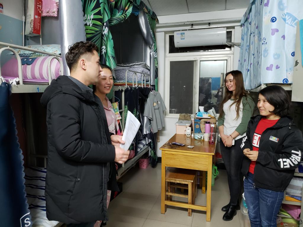 我院专兼职辅导员深入学生宿舍,全面了解了宿舍成员的返校情况、宿舍文化建设、宿舍卫生和安全问题,重点检查了宿舍违章电器使用情况等容易引起安全隐患的问题。辅导员热依木与同学们进行了亲切交流,并询问了同学们寒假读书学习和实践任务的完成情况。他从身心健康、人身安全、自主学习等几个方面给予了建议,建议同学们要照顾好自己的身体,校内外注意自身安全,要将尽快进入求学者角色,同时对寒假期间所完成的各类学习和实践活动进行细致总结,要在各班举行寒假见闻座谈会或专题交流分享会,对寒假所见所闻、家乡变化、预科心得和读书学习进行分享、交流。