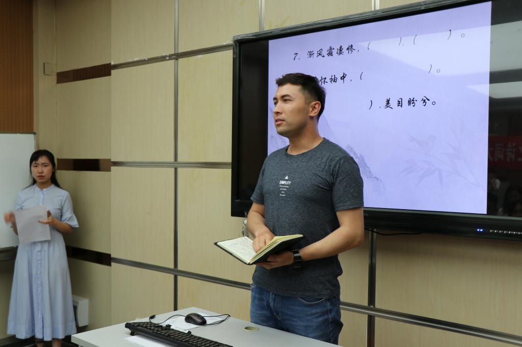 最后,辅导员热依木老师对本次活动做了简要总结。他表示此次活动主题鲜明,内容新颖,希望能够通过对这些诗词知识的比拼和赏析,带动同学们重温曾经学过的古诗词,分享诗词之美,感受诗词之趣,从古人的智慧和情怀中汲取营养,涵养心灵,同时勉励同学们坚定信仰、砥砺品德,珍惜时光、勤奋学习,努力成长为有理想、有本领、有担当的社会主义建设者和接班人,为实现中华民族伟大复兴中国梦贡献智慧和力量。