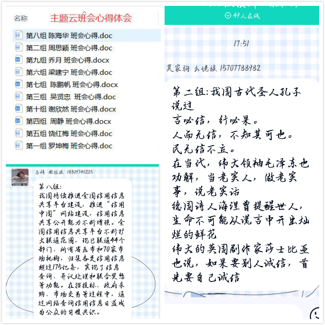 1、主题班会拉开活动序幕。活动伊始,学院各预科班根据2020年学生工作要点,积极围绕本届活动月主题召开线上班会,将诚信教育活动与校风传承、学风建设、文明校园建设相结合,让“秉信立行”观念融入班级建设、课堂学习、学术研究和宿舍生活,影响带动更多学生以诚修德。