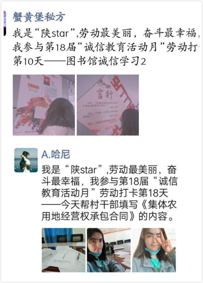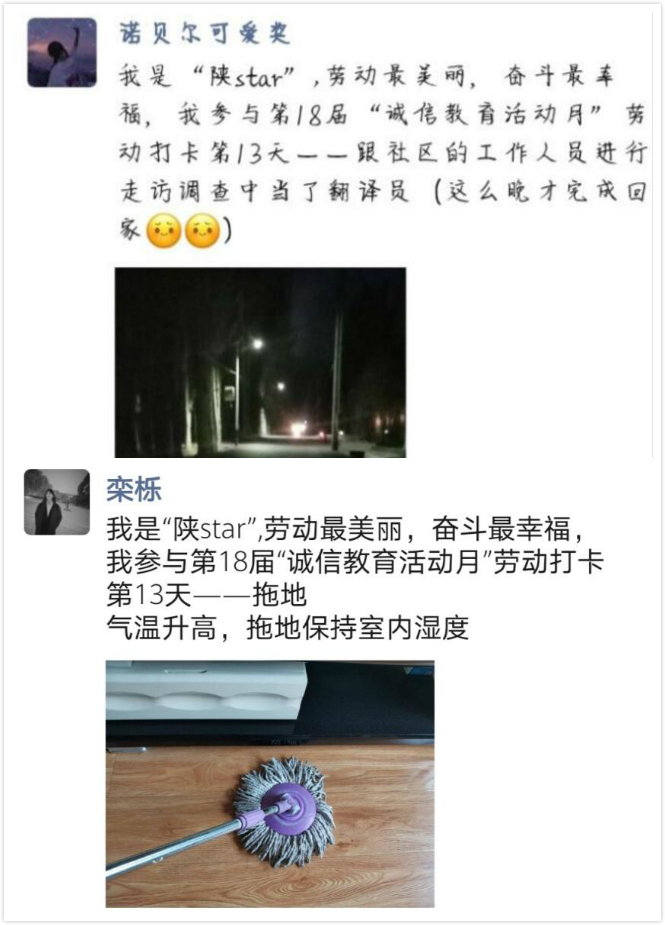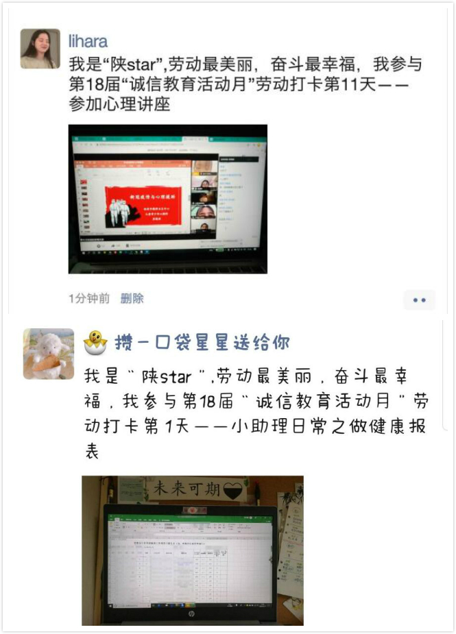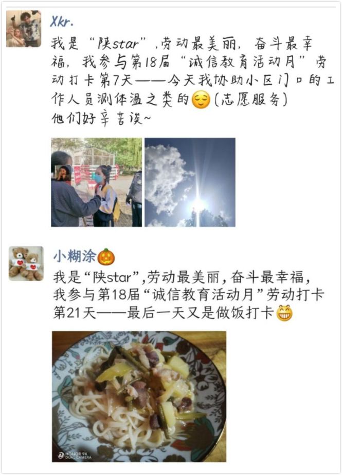 5、线上打开夯实教育效果。为加强疫情期间学生居家劳动教育,将诚信教育与劳动教育有效结合,学院丰富主题教育活动形式,开展“21天”诚信劳动打卡活动。鼓励学生将连续21天参与劳动的画面进行线上平台展示,分享劳动心得体会,较好地提升了学生门热爱劳动、诚实守信的思想意识。我院76名学生积极参加此项活动,分享了自己劳动收货和感悟。