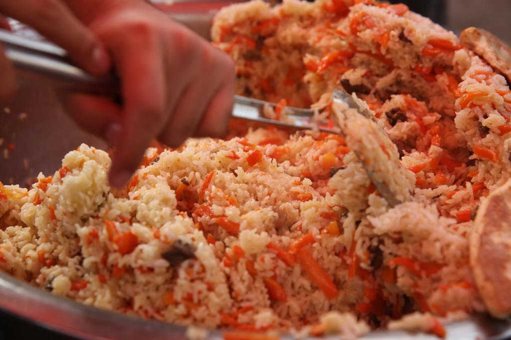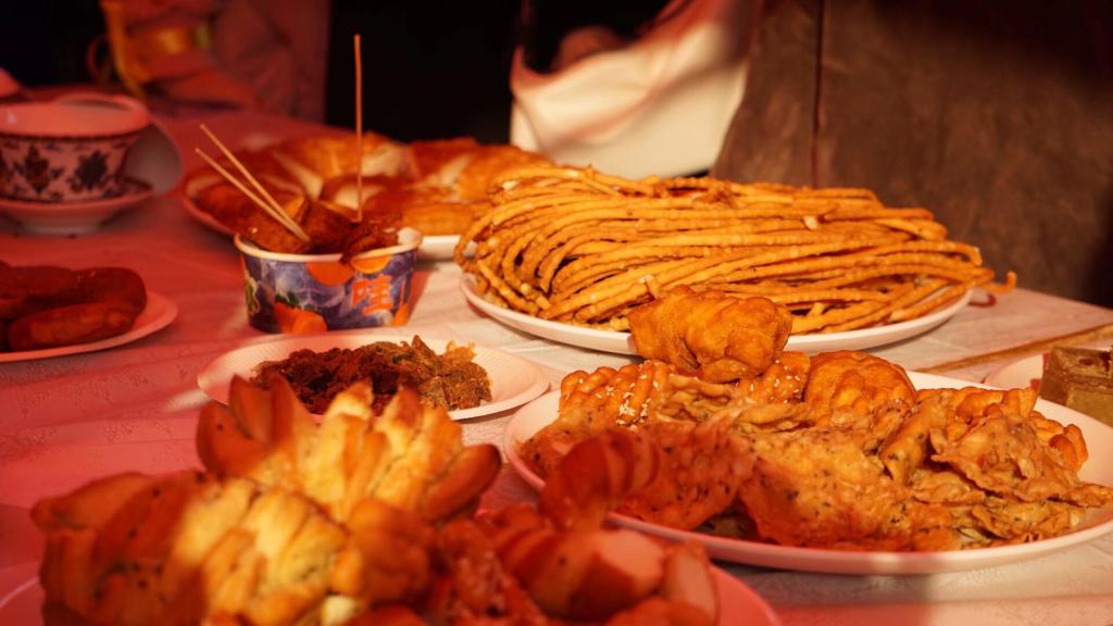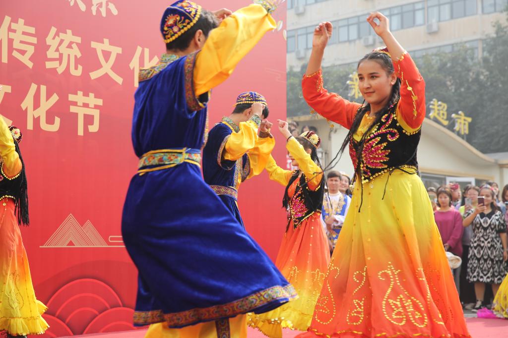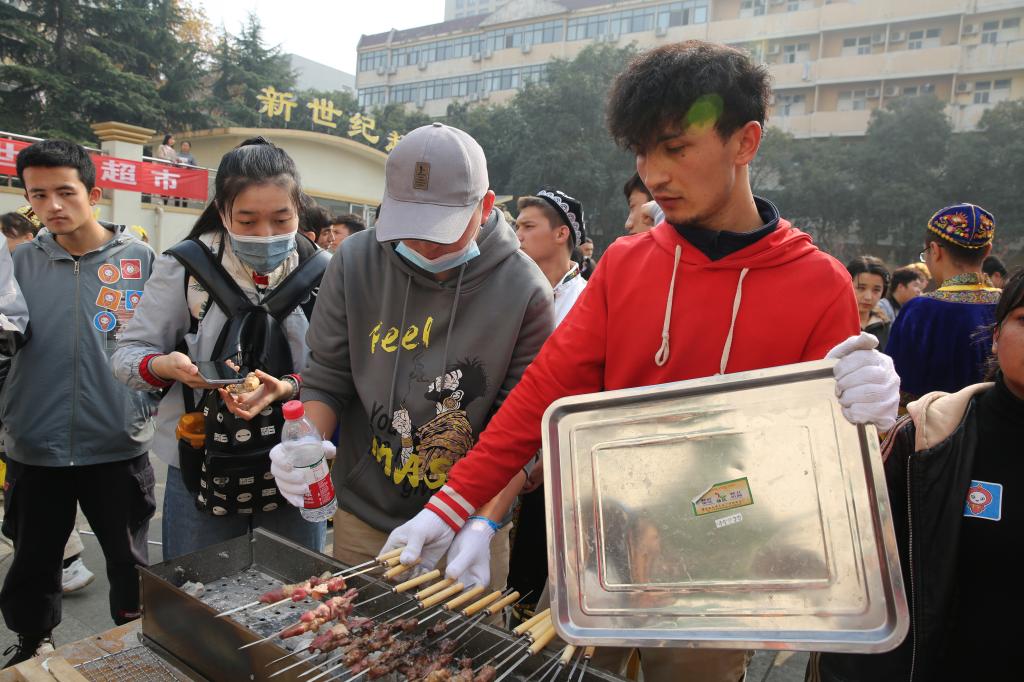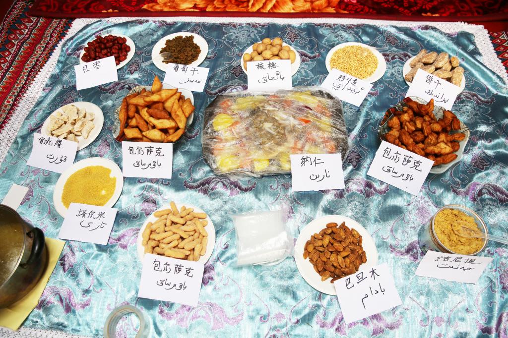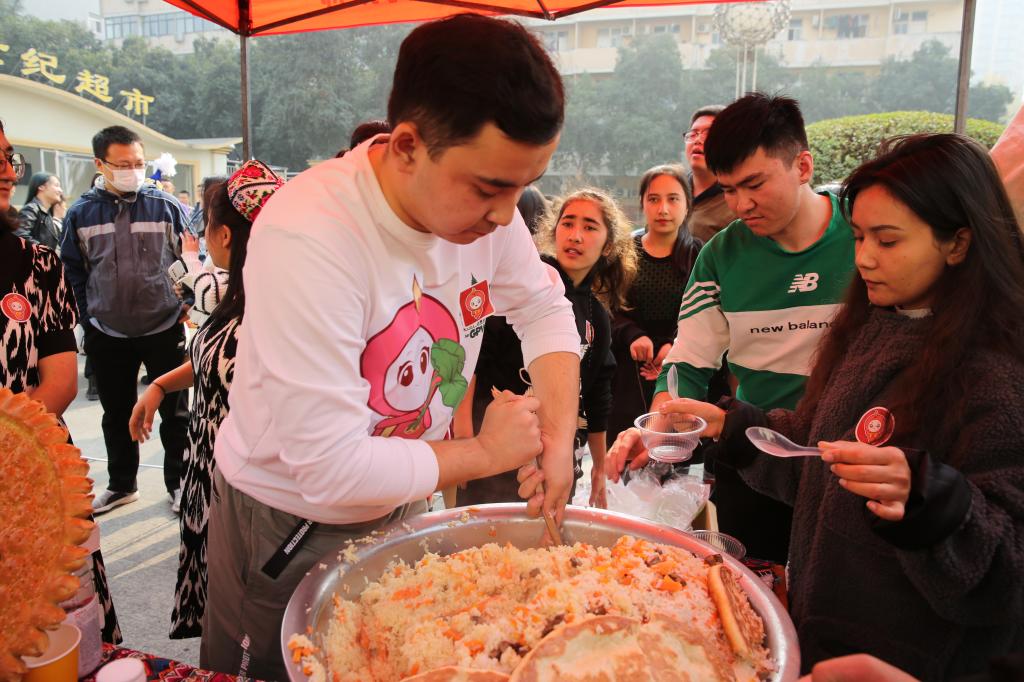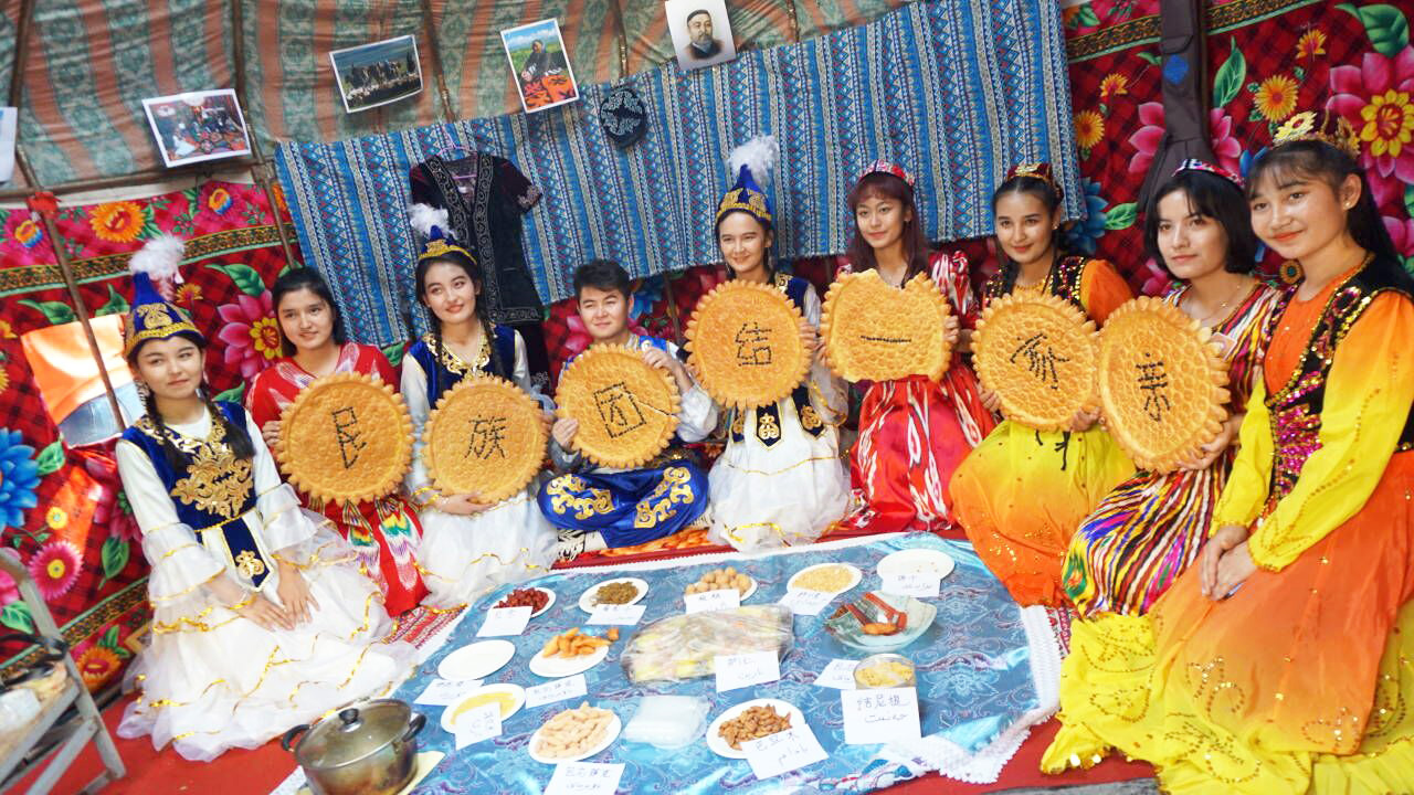 维吾尔族的美食极具特色,其中抓饭、烤肉、烤包子等受到了广大师生的欢迎。新疆特色葡萄干、红枣堆等干果叠于盘中。香脆可口的馕饼上用芝麻拼成“民族团结一家亲”的字样。舞蹈艺术也同样特点鲜明,奔放而富有激情的传统民族舞、刀郎舞、萨玛舞展现了维吾尔族舞蹈文化的独特魅力。哈萨克族同学将草原上的毡房搬进校园,毡房内陈列着民族工艺品与展示民族风情的图片,走进毡房,便可了解到哈萨克族的风土人情,毡房里身穿民族服饰的哈萨克族同学,也在为观众讲解哈萨克族的传统文化与风俗习惯。