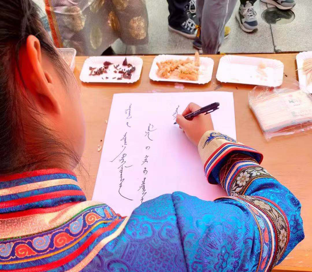 回族美食花样繁多,饮食文化也是流光溢彩,八宝茶飘香四溢,茶具精巧玲珑,民族小吃如馓子、果果、甜胚子、辣条等,让同学们一开眼界、大饱口福。苗族同学带来了地方特产——辣椒,满足了南方同学的无辣不欢的喜好。以花鸟鱼虫为主题的苗绣,精美绝伦的苗族银饰不得不让人感慨苗族人民的心灵手巧。蒙古族香气浓郁的奶茶、牛肉干、奶皮子、奶豆腐向我们展示了蒙古族的饮食特色,而马头琴与蒙古舞表演似乎瞬间把人带入那片辽阔的的大草原。掌握蒙古书法的同学大显身手,以蒙文写诗,民族文字魅力便生动展现在观众的眼前。