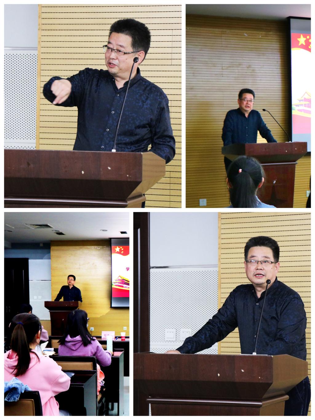 最后,学院党总支书记郑生忠老师为同学们带来团校培训开课第一讲。郑老师发问当代青年:什么是当代青年使命与担当?通过纵览国际形势,回顾中国战疫历程来坚定青年“四个自信”树牢青年“四个意识”;在回顾党波澜壮阔的历史中,让同学们知道新中国崛起是中国共产党的正确领导、人民的选择、历史的必然。郑老师通过讲党史、讲近代史、讲社会主义发展史,带领同学们了解历史进程,感悟历史成就,把握历史大势,同时希望各位同学在本次团校培训中能做到知史而自信,学史而惜今,信史而笃行。他强调:“我们全体老师和学生要全身心的认真的学习党史,用党史和党的精神武装我们的思想,筑牢我们中华民族共同体意识,筑牢我们跟党走的坚定信念,并且要把理论知识投入到实践当中去,要有心得、有记录、有成长、有实践”。