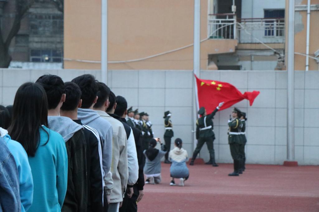 6时30分,升旗仪式正式开始,我院师生庄严肃立,升旗手、护旗手肩擎国旗,迈着矫健的步伐,护送国旗来到国旗台,挥洒国旗、行举手礼。在雄壮的国歌声中,鲜艳的五星红旗冉冉升起、高高飘扬,师生用注目礼向国旗承诺:为了不辜负党和人民期望,全体学生要刻苦学习,投身社会,为建设社会主义现代化强国而努力奋斗。