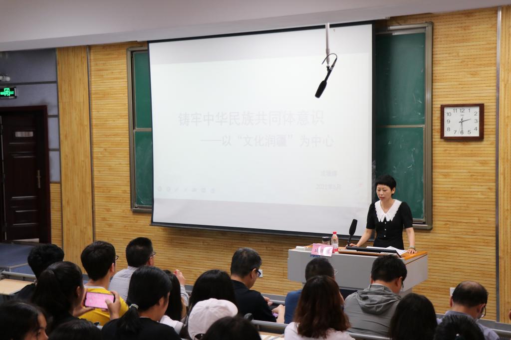 成珊娜老师从“简述历次中央新疆工作座谈会”“关于‘文化润疆’”“新疆文化建设取得成绩”三方面深入解读了“文化润疆”的价值内涵和时代意义,分享了新疆的多民族文化和丰富多彩的新疆故事;通过文化遗产和历史古迹详细论述了新疆各民族与中原地区同根同源,血脉相连的历史基因;最后,她列举了一系列文艺作品来介绍新疆文化建设取得的成绩。成珊娜老师指出:“新疆是中国领土不可分割的一部分。新疆历来就是多民族聚居,多文化并存的地方。中国多民族大一统格局,是包括新疆各族人民在内的全体中华儿女共同奋斗造就的。‘文化润疆’是铸牢中华民族共同体意识,实现中华民族伟大复兴中国梦的必然要求。文化将我们凝聚在一起,共同抵御外来思想上的侵蚀,共同构筑我们的精神家园。”