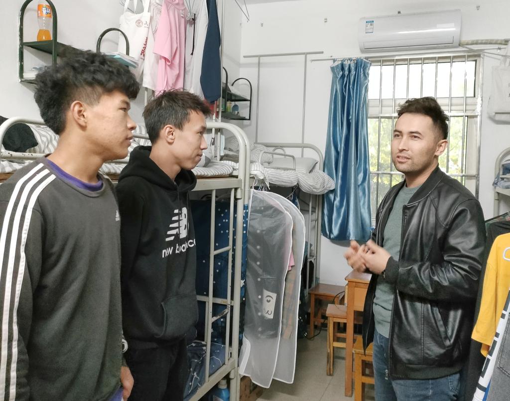 走访过程中热依木与学生亲切交谈,询问同学们的学习、生活情况,并叮嘱同学们要提高安全防范意识,遵守学生宿舍管理规定,他强调,在新冠疫情期间,更要做好个人防护,勤开窗,多通风,并注意天气变化,穿衣保暖,勤加锻炼,保持室内卫生的整洁干净,养成良好的作息习惯,共同营造文明的寝室氛围。如果在生活或学习中遇到困难及时向老师反馈、寻求帮助。