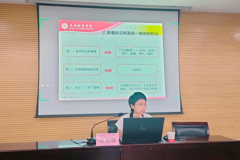 围绕新疆抗日民族统一战线这一主题,成珊娜老师首先从新疆的地理位置和多方条件讲述了新疆抗日民族统一战线建立的背景,讲解了新疆抗日民族统一战线有共同纲领、有特殊组织合作、实行“三不”原则等特点。