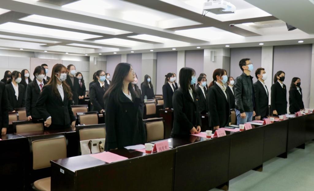 新一任主席团成员萨齐日介绍了新一届学生会各部门的成员组成和职能属性。2022-2023学年新任学生会执行主席陈彦语与2021-2022学年学生会执行主席何诺冉完成了会旗交接。