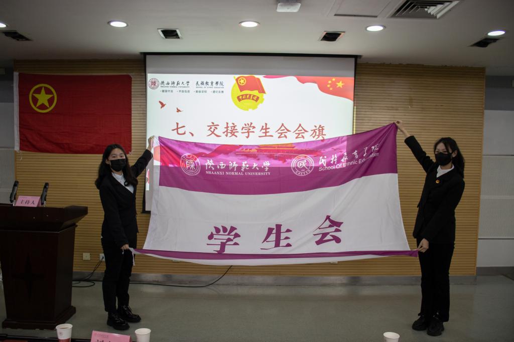 新任学生会执行主席陈彦语与上一任学生会执行主席何诺冉交接学生会会旗