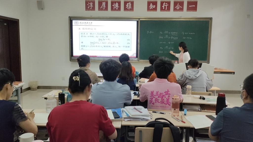 此次教学示范课由王文华老师执教,选取《高等教育基础系列教材:高等数学基础》中函数的连续性为授课内容。王文华老师以生活实例为课程导入,激活学生课堂积极性,引领学生走进课堂内容,便于学生理解数学中抽象性的定义与概念。在实际课堂中,王文华老师将直观动态变化图与静态核心知识点板书相结合、课堂讲授与启发思考相结合、教学目标与思政目标相结合,呈现完整课堂教学结构,课堂效果甚佳。
