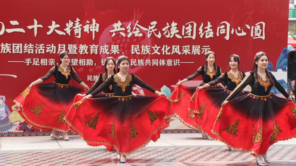 同学们还为现场观众带来了民族舞蹈串烧《中华民族一家亲,共谱民族团结情》。轻盈欢快的哈萨克族舞蹈,热情豪放的维吾尔族舞蹈,豪迈磅礴的蒙古族舞蹈……民族舞蹈展现着少数民族的优美姿态,跳动着独特的文化精髓。