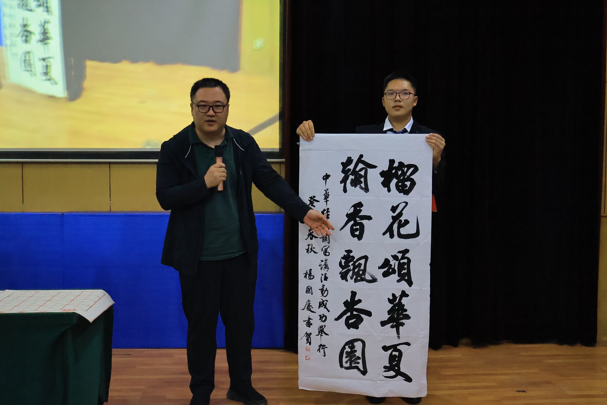 在最后的颁奖典礼上,三位同学集体诵读的《葬花吟》将大家再一次代入了那个经典永存的年代;文学院赵文老师的精彩点评认为此次大赛彰显了我院师生风采,也赛出了高水平,勉励之意满满;文学院杨国庆老师的现场挥毫题字,更是为师生们送上了一道书法魅力的文化大餐,也再一次将大赛的火热氛围推向高潮。此外,到场嘉宾还为“笔墨中国”汉字书写大赛获奖学生进行了颁奖。