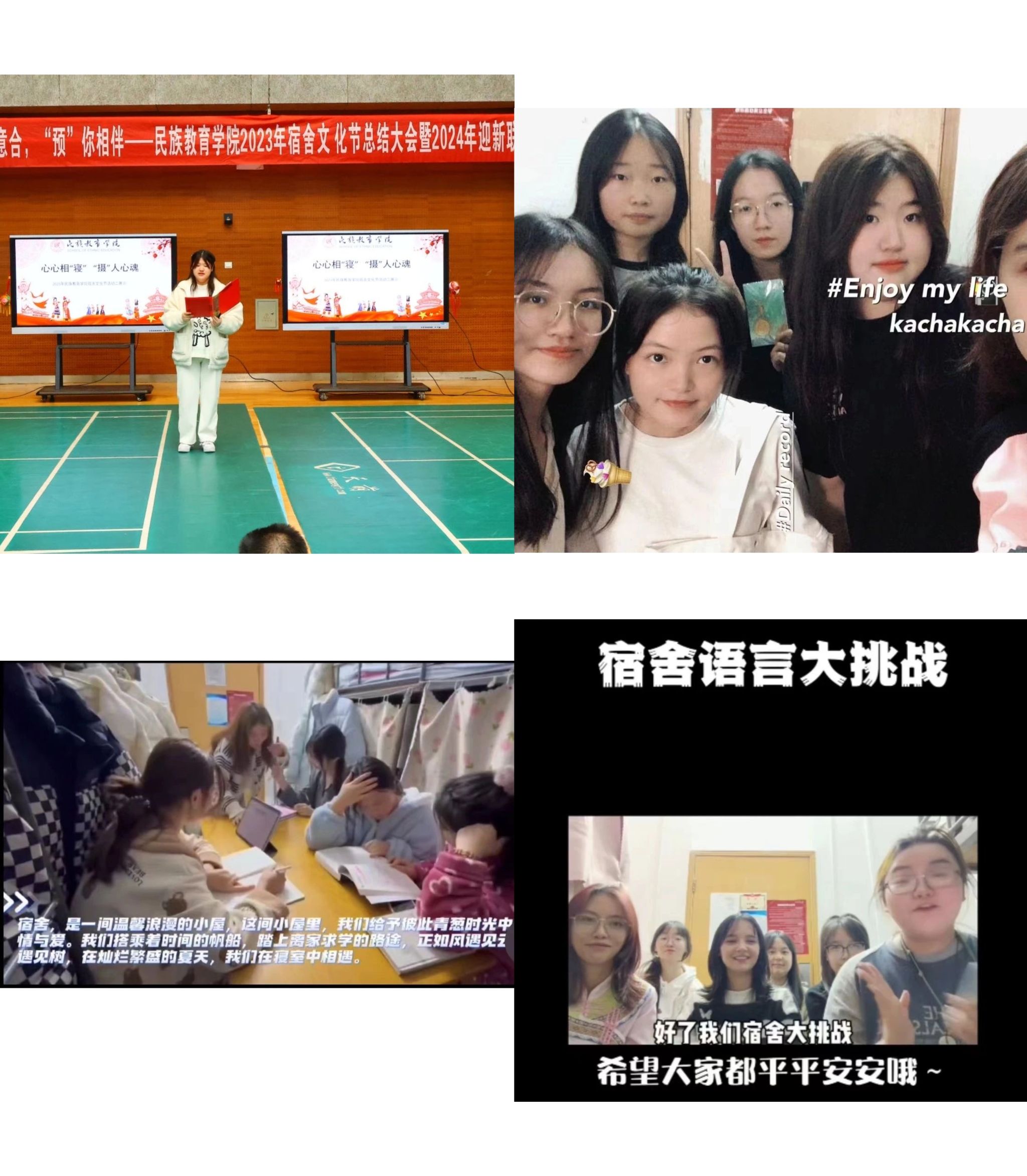 该活动以拍摄宿舍vlog形式,多角度展示宿舍文化和舍员风采。此次活动共收集了15个宿舍的参评视频。各个宿舍从宿舍成员、宿舍环境、团建日常以及民族服饰语言等角度内容入手,以新颖、个性、独特的方式展现了中华民族文化的多元性,充分展示出学院各民族学子爱国爱校、团结友善的精神风貌。