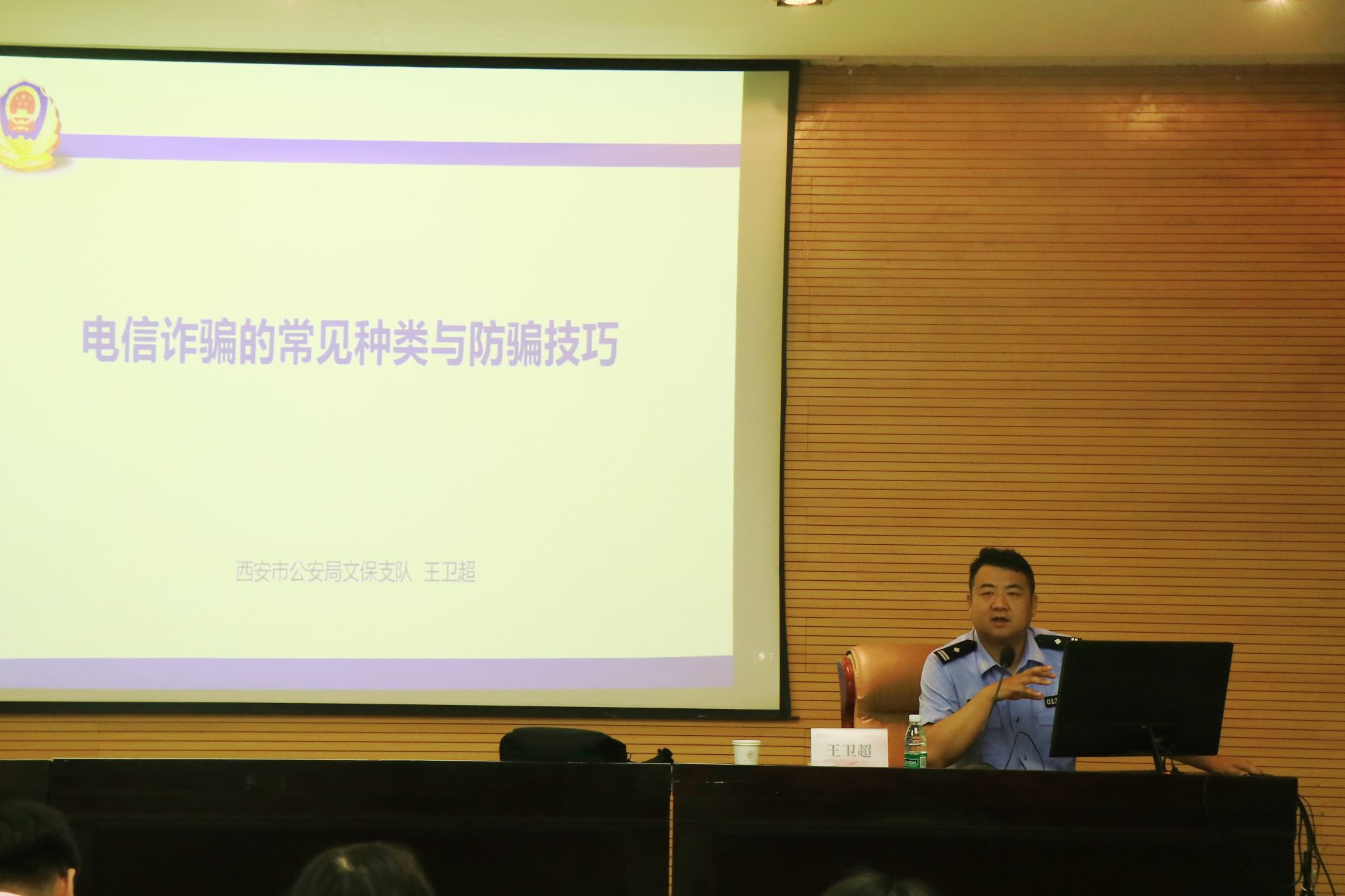 联合外国语学院在雁塔校区崇鋈楼学思堂组织举办校园安全教育专题讲座,邀请西安市公安局文保支队四大队副大队长王卫超同志主讲。学院党总支副书记高冬、团委书记热依木·努尔麦麦提以及全体学生参加了本次讲座。