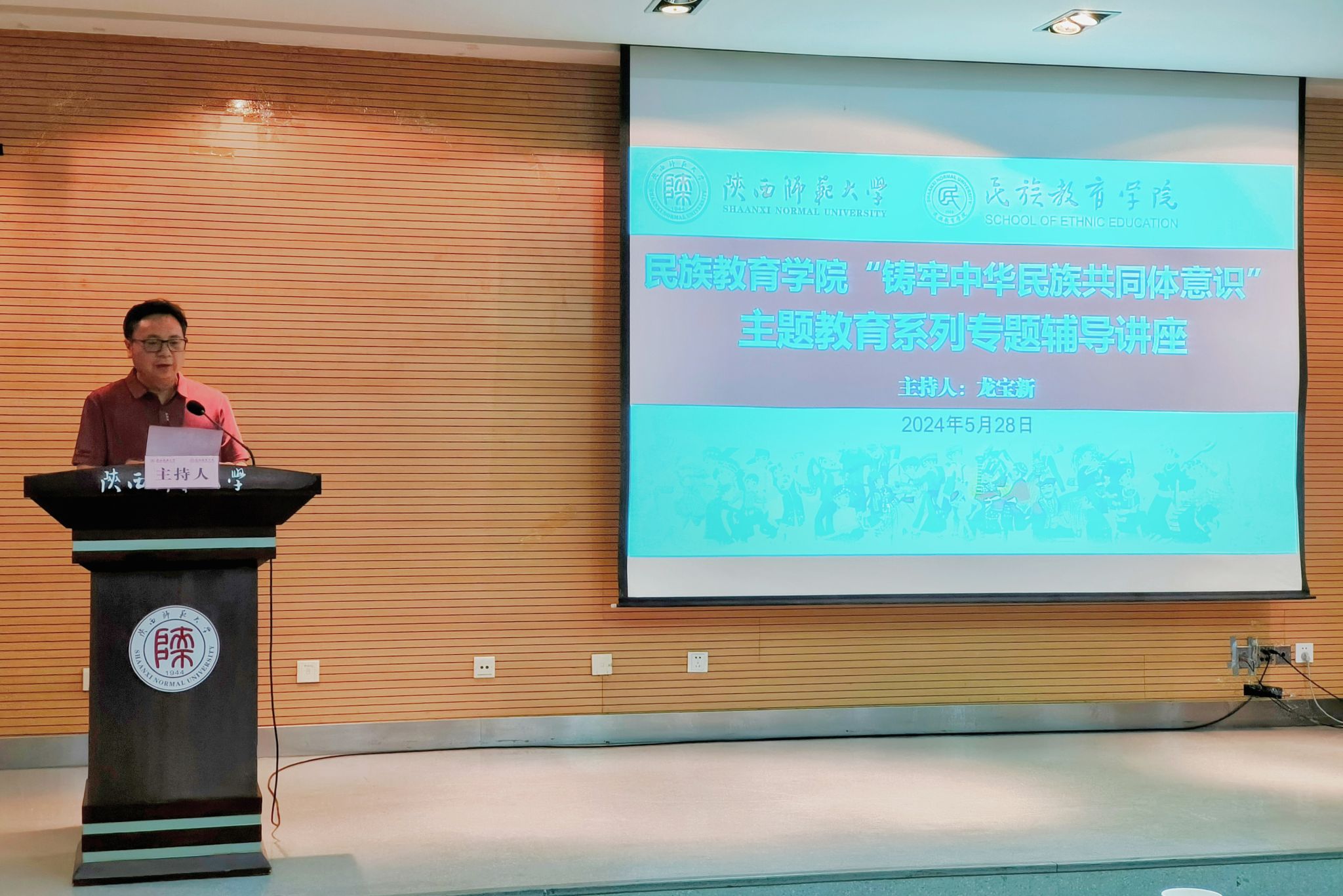 “铸牢中华民族共同体意识”专题系列讲座第二讲于2024年5月28日于雁塔校区崇鋈楼归仁堂开讲。陕西省铸牢中华民族共同体意识研究基地首席专家,学校马克思主义学院二级教授热合木江·沙吾提作以《铸牢中华民族共同体意识 推动边疆少数民族地区高质量发展》为题的专题辅导讲座,讲座由学院院长龙宝新主持,全体师生参加了讲座。