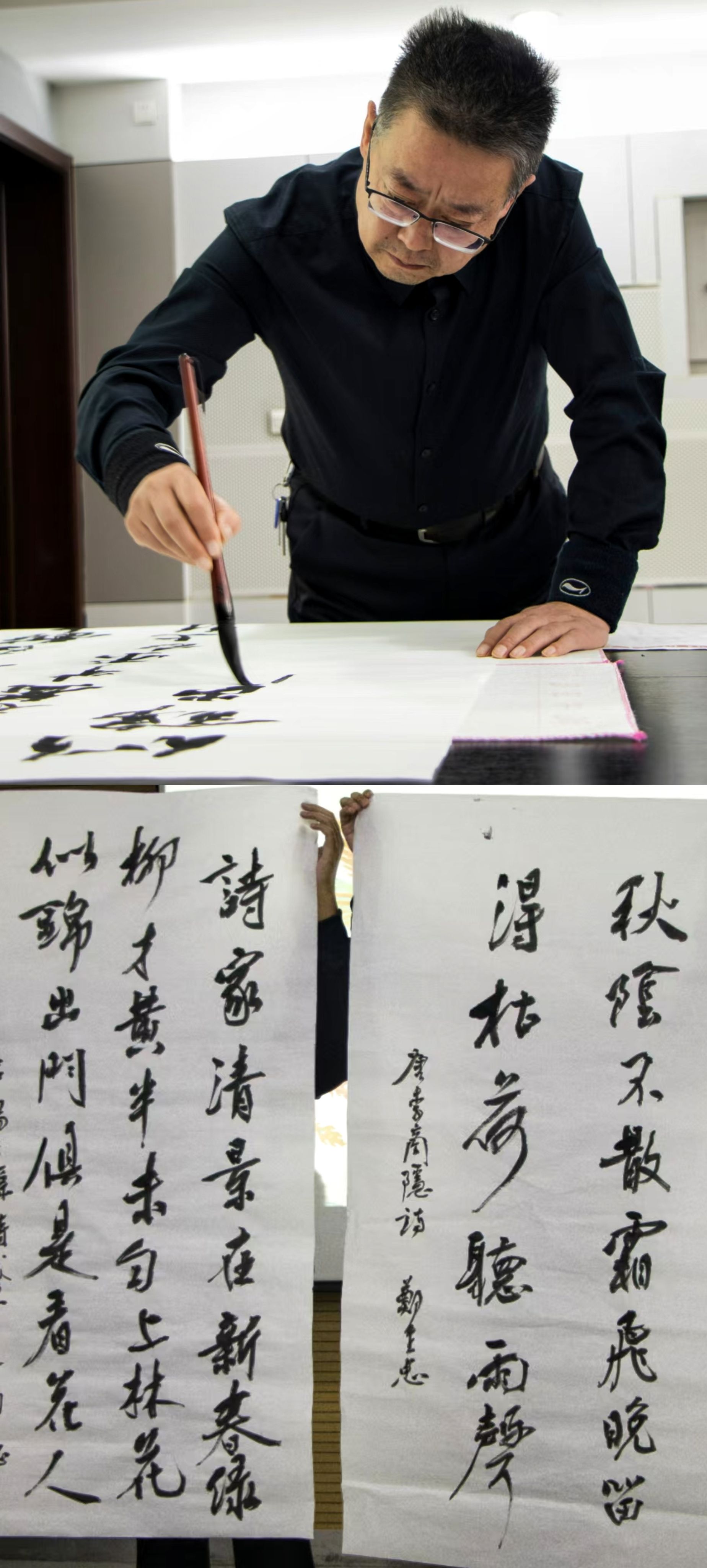 在颁奖典礼的最后,郑生忠书记现场挥毫泼墨,书写了李商隐的“秋阴不散霜飞晚,留得枯荷听雨声”以及杨巨源的《城东早春》。“诗家清景在新春,绿柳才黄半未匀”这句诗,勉励了同学们要珍惜青春时光,奋发向上,用心体会语文之美,在青春岁月里尽情挥洒才华,共同创造美好的未来。
