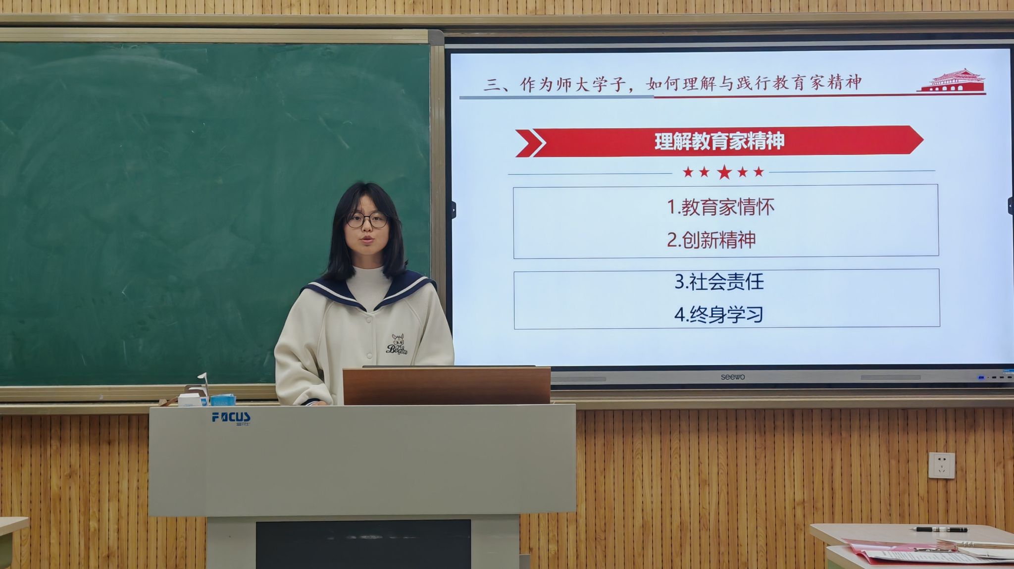 活动伊始,学生会主席团执行主席丁晓婷以《紧紧围绕立德树人根本任务朝着建成教育强国战略目标扎实迈进》为主题做了理论学习培训,她带领与会同学深入学习教育家精神内涵,剖析了教育在学生全面发展中的核心意义,详细阐述了在建设教育强国过程中教育家精神所要求的理想信念、社会责任和创新精神对每一位学子成长的深远影响,鼓励同学们在未来的求学道路上,秉持勇于探索的精神,坚定终身学习的信念,积极为教育强国的伟大目标贡献自己的力量。