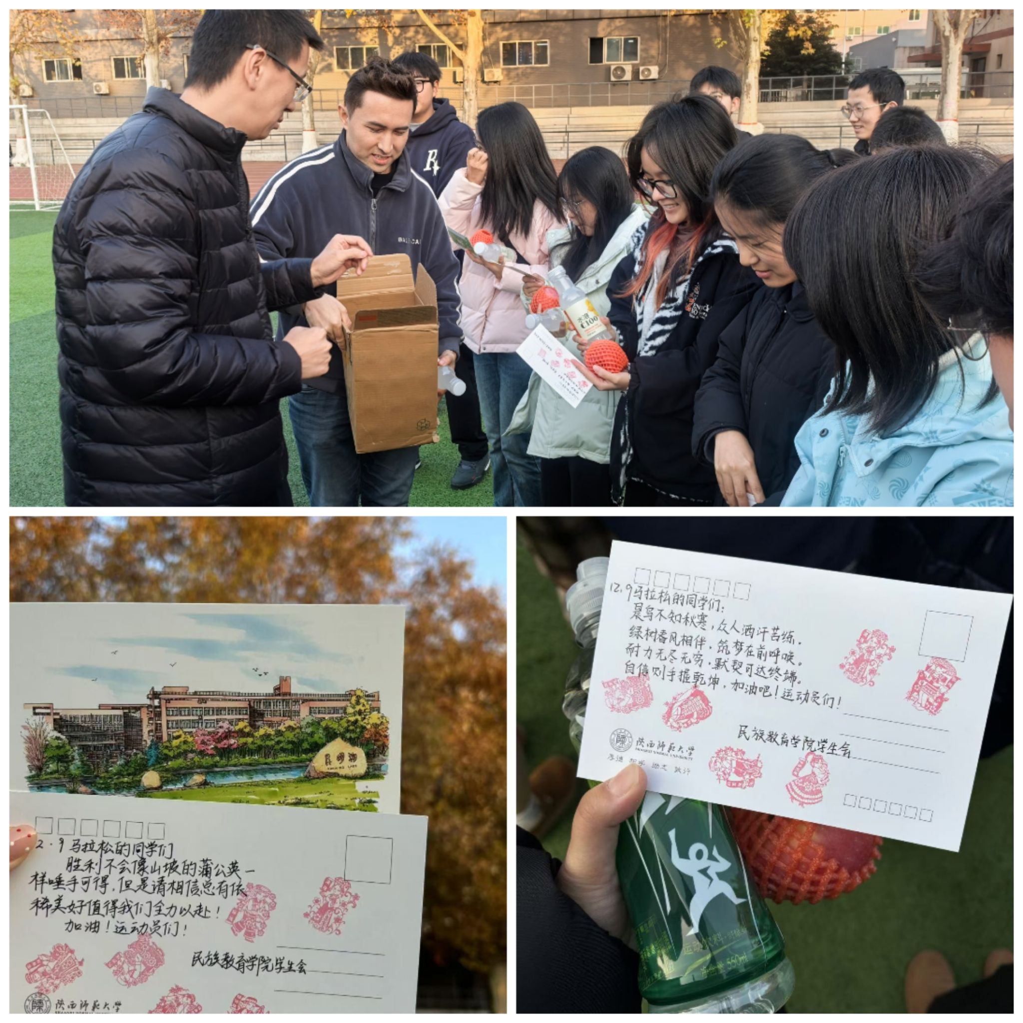 此次比赛运动员们刻苦训练、积极备战。为向运动员们表示关心与问候,学院于12月6日在雁塔校区田径场开展赛前动员。学院党总支副书记高冬,团委书记、专职辅导员热依木·努尔麦麦提,兼职辅导员刘江珊前往训练现场,向运动员们强调了赛事安全事项,为他们加油鼓劲,并向运动员们分发印有专属印章的纪念品。现场氛围热烈,运动员信心十足,蓄势待发。