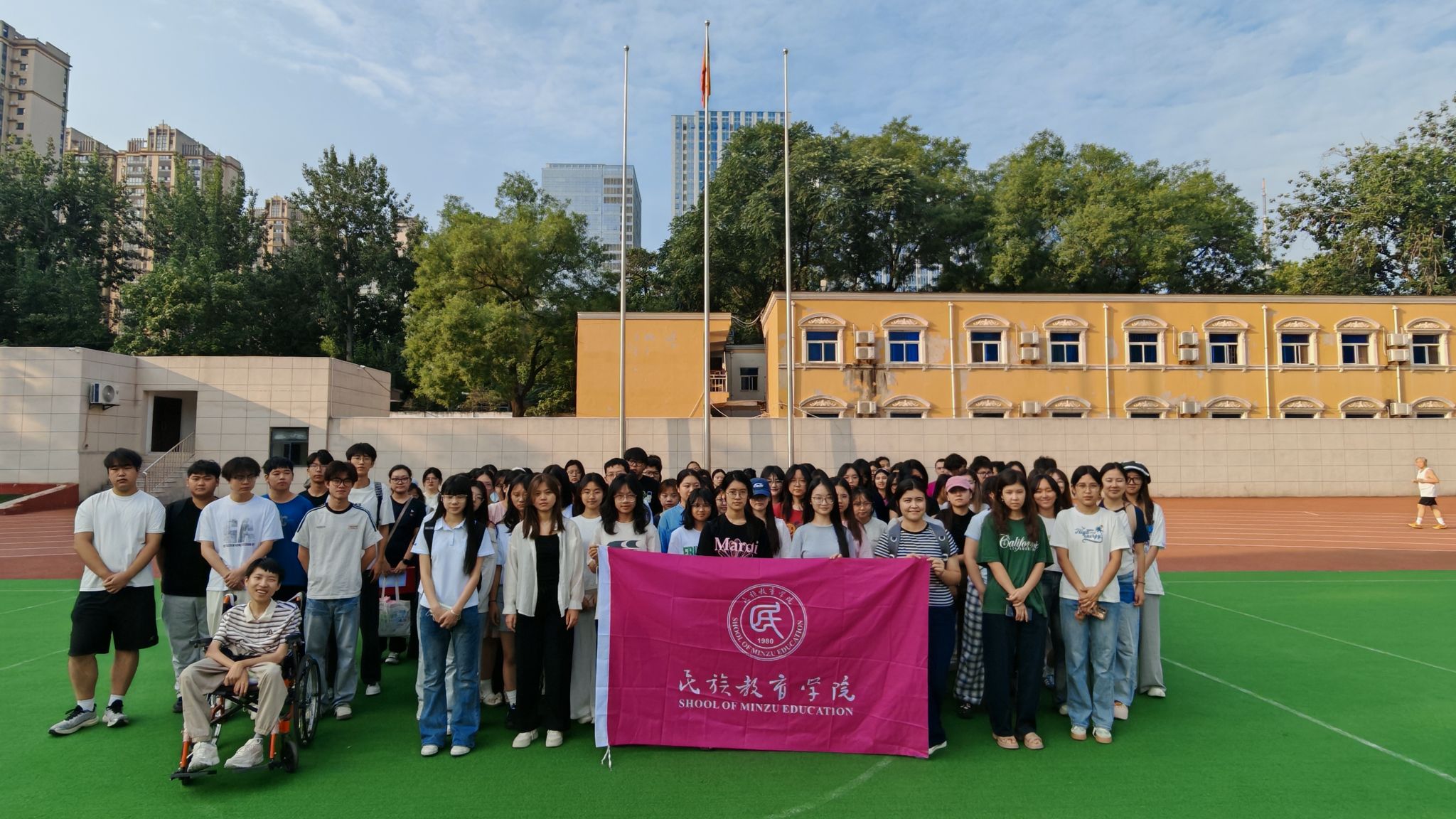 此刻,国旗下的我们即将奔赴不同的学院,但请记住:无论未来走到哪里,胸前的校徽永远闪耀,心中的“民教”情怀永不褪色。让我们带着这段时光赋予的勇气与热爱,在新的征程上继续奔跑——因为我们知道,一年的相聚虽短,一生的羁绊却早已在这片土地上生根发芽。谢谢大家!