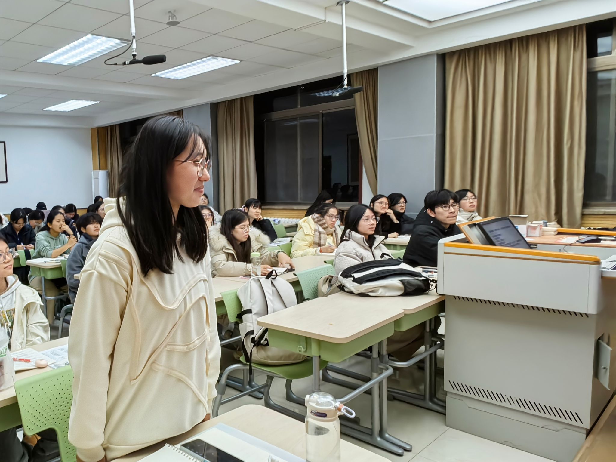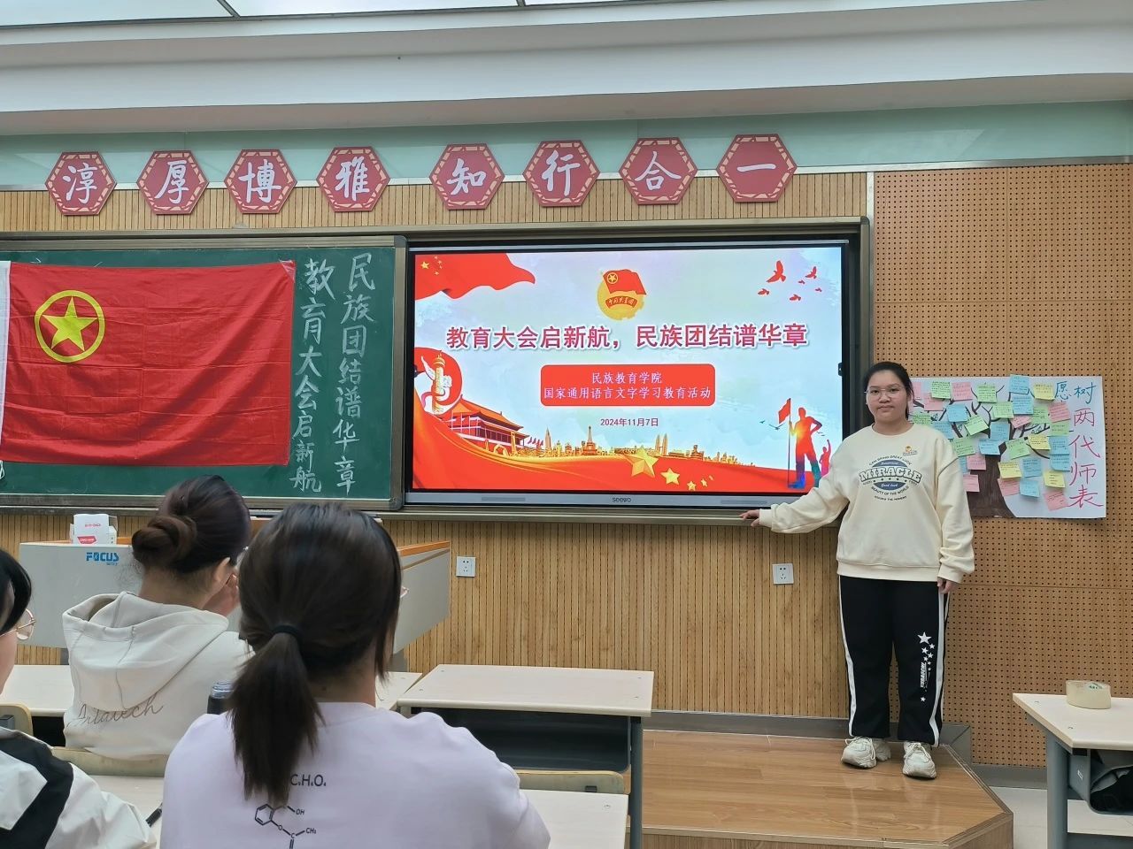 第一期活动,学院以“教育大会启新航,民族团结谱华章”为主题拉开系列活动序幕。前期通过线上问卷与线下采访调研学情,精准把握学生需求,为活动设计提供数据支撑。首场活动中,各班团支书领学习近平总书记于2023年6月30日在二十届中央政治局第六次集体学习时的讲话《开辟马克思主义中国化时代化新境界》,带领学生深刻领悟习近平新时代中国特色社会主义思想的核心要义,明确国家通用语言文字作为文化传承载体、教育基础要素的战略意义。