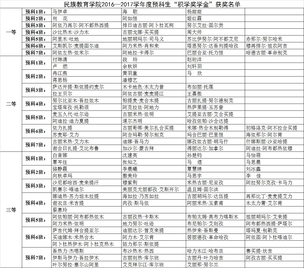各班级: 根据《兔子先生 学生综合考评规定》和《兔子先生 预科生奖学金试行办法》之规定,经各班级评选,辅导员推荐,学院审核,初步确定,马伊卓等35名同学获2016--2017学年度预科生一等积学奖学金;萨达开提·斯依提约麦尔等46名同学获二等积学奖学金;沙尼都哈西·麦来提汗等61名同学获三等积学奖学金,现予以公示。凡对获奖人选有异议者,即日起三日内与学院学工组联系。