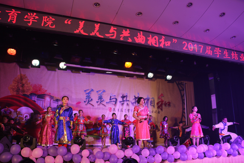 2017届学生结业晚会在少数民族骨干计划研究生劲爆的歌舞表演《flame》中拉开帷幕,晚会分为“各美其美”、“美人之美”、“美美与共”三个篇章进行。舞蹈《萨玛》、《柯尔克孜族女孩》、《黑走马》、《花儿与少年》表现出各少数民族不同的舞蹈风格,同学们用丰富的肢体语言以及他们对自身民族舞蹈情感的处理深深感染了在场的每一位观众。吉他弹唱《爱人的告别》将青春的感恩诠释得到了极致。歌曲串烧《风吹原野,归来少年》,动听的歌声情感充沛,意蕴无穷。劲爆舞蹈《心跳》将拉丁舞与印度舞完美结合,向大家展现了别样的异域风情。预科二班相声《大学那些事儿》、小品《民族根•中华魂》,预科四班表演的情景剧《我在师大“预”见你》,表演生动形象,将大家带入到了昔日开学报到、课堂课下、考试等场景,感染了每一位老师同学,使整场晚会掌声不断。蒙古族学生为大家演绎的歌伴舞《深情草原》充分展示了蒙古族能歌善舞,待客热情大方的情怀,一条洁白的哈达、一杯鲜甜的马奶酒表达的是少数民族学子对学校培育之情的诚挚谢意。学工组7位辅导员为大家带来了精彩歌舞《I LUV IT 》,动感的舞蹈、感人的歌声完美结合,使得晚会呐喊声不断。最后,晚会在各少数民族学生共舞的《民族大联欢》中圆满落下帷幕。