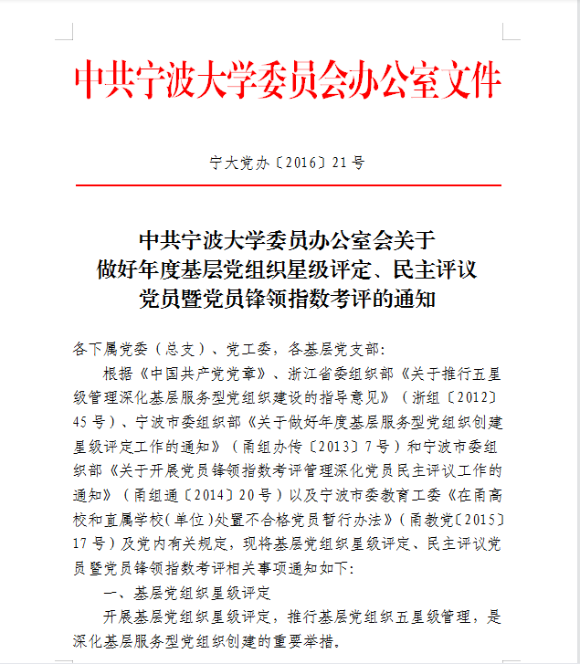 中共宁波大学委员会办公室关于做好年度基层党组织星级评定、民主评议党员暨党员锋领指数考评的通知