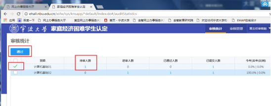 在审核统计页面也可进行批量审核操作,勾选班级后,点击“通过”按钮,可对所选择班级中所有待审学生进行批量通过操作。