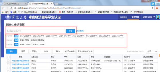 1.审核页面默认展示未经过筛选的全部学生数据,即全部学年、全部困难类型、全部审核状态的学生。点击筛选条件,可筛选学生。系统默认筛选条件有评定学年、困难类型、审核状态三个,也可在搜索框按照学号姓名搜索单个学生。