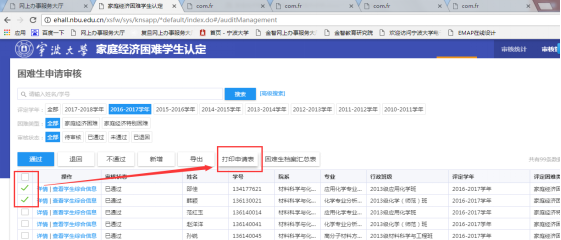 1、 勾选单个、多个学生,点击“打印申请表”按钮,可进行“家庭经济困难学生认定申请表”的查看。