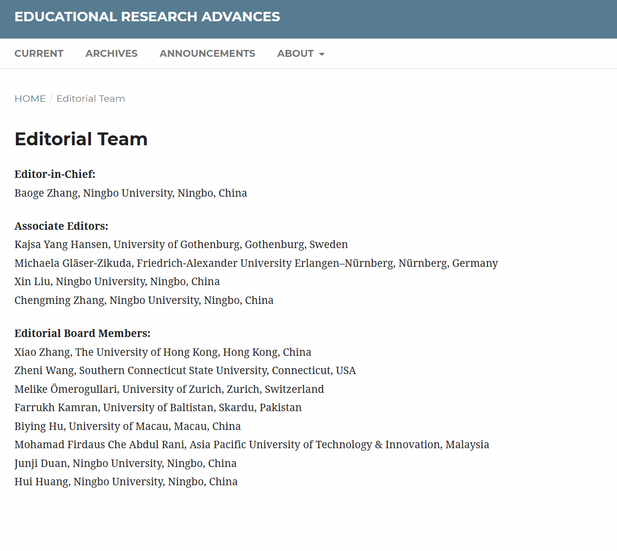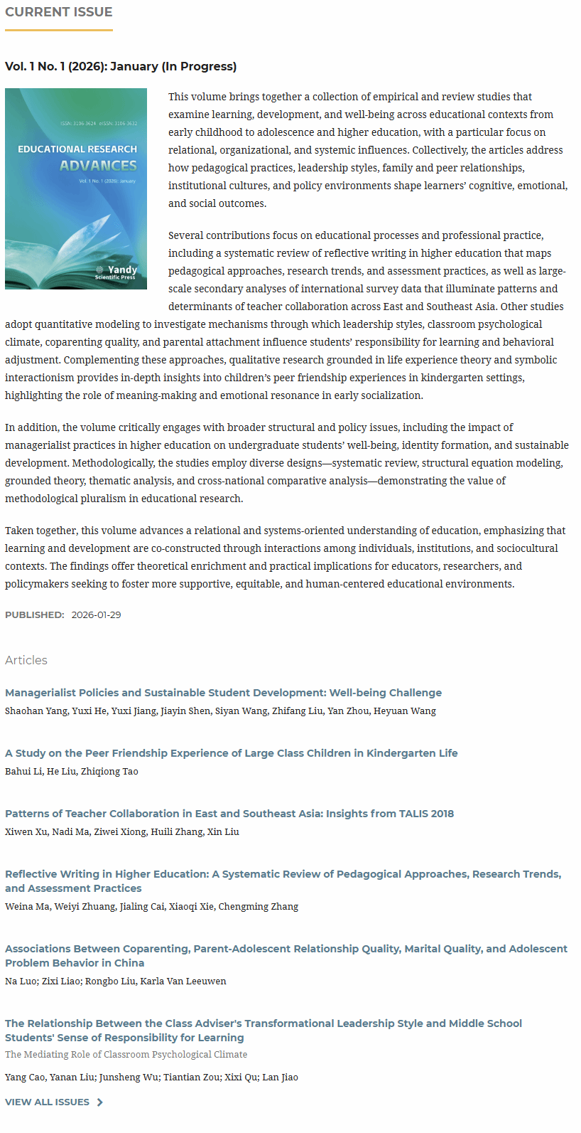 2026年1月29日,由宁波大学教师教育学院主办的英文学术期刊《教育研究前沿》(Educational Research Advances)(ISSN: 3106-3632; eISSN: 3106-3624)正式创刊,并出版首期。期刊立足教育研究前沿,聚焦教育理论创新与实践探索的深度融合,致力于打造具有国际影响力的高水平学术交流平台。《Educational Research Advances》由宁波大学教师教育学院院长张宝歌教授担任主编,编委会汇聚来自全球高校与研究机构的知名专家学者。其中,瑞典哥德堡大学Kajsa Yang Hansen教授、德国埃尔朗根-纽伦堡大学Michaela Gläser-Zikuda教授,以及宁波大学刘鑫副教授、章成铭副教授担任副主编。历经半年多的紧锣密鼓筹备,在国际化办刊理念与多方协同支持下,期刊坚持开放获取(Open Access)与严格同行评议相结合的办刊理念与运作机制,创刊阶段免收文章处理费(APC),并面向全球读者免费开放获取。其中,重点刊载教育政策、教学创新、学习科学、教师发展及跨文化教育等领域的高质量研究成果,旨在促进全球教育研究的知识共建与学术对话,并持续提升我院教育学科的国际知名度。目前,期刊官方网站(//era.yandypress.com/)已正式上线,面向全球读者开放获取。未来,《Educational Research Advances》将持续拓展国际学术合作网络,完善学术传播与服务体系,不断提升期刊学术质量与国际影响力,努力建设成为连接中国与世界教育研究的重要学术纽带。《Educational Research Advances》的创办,是宁波大学教师教育学院推进教育学科国际化、加强高水平学术平台建设的重要举措,体现了学院积极参与全球教育知识体系构建的责任与担当。学院诚挚欢迎海内外学者关注并支持期刊发展,踊跃投稿、阅读、审稿与交流等,共同推动教育研究的高质量发展。