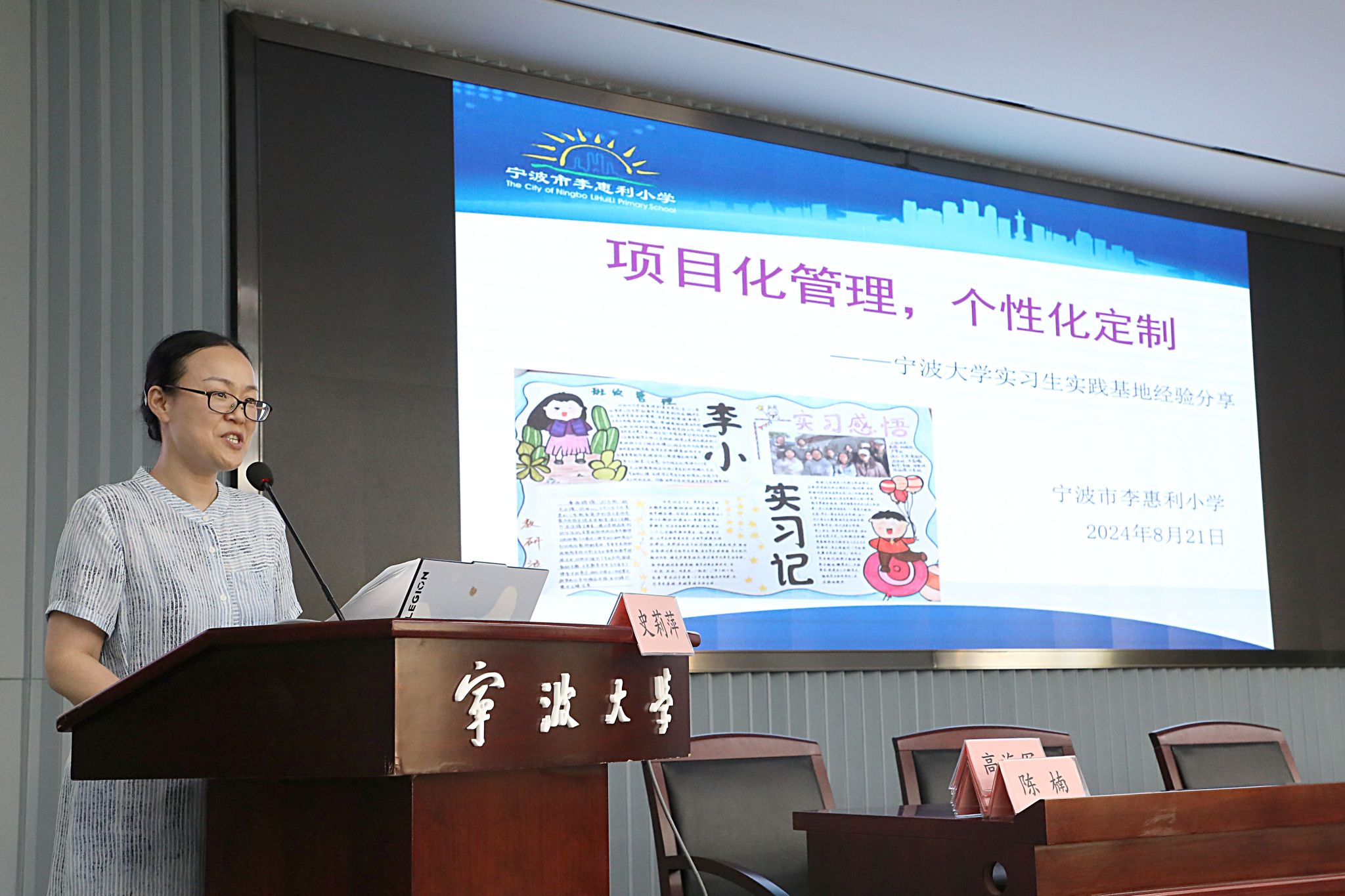 宁波市李惠利小学教导主任史莉萍以《项目化管理,个性化定制——宁波大学实习生实践基地经验分享》为报告主题,介绍了李惠利小学在实习生培养和教育教学管理方面的宝贵经验和创新做法。她围绕“保障”“融合”“奖励”三个关键词,探讨了双方在学校和导师层面的合作经验。在多年合作中,李惠利小学与宁波大学建立了富有成效的合作经验,促进了实习生成长,也为学校带来了新的教学理念和活力,双方实现了互利共赢。