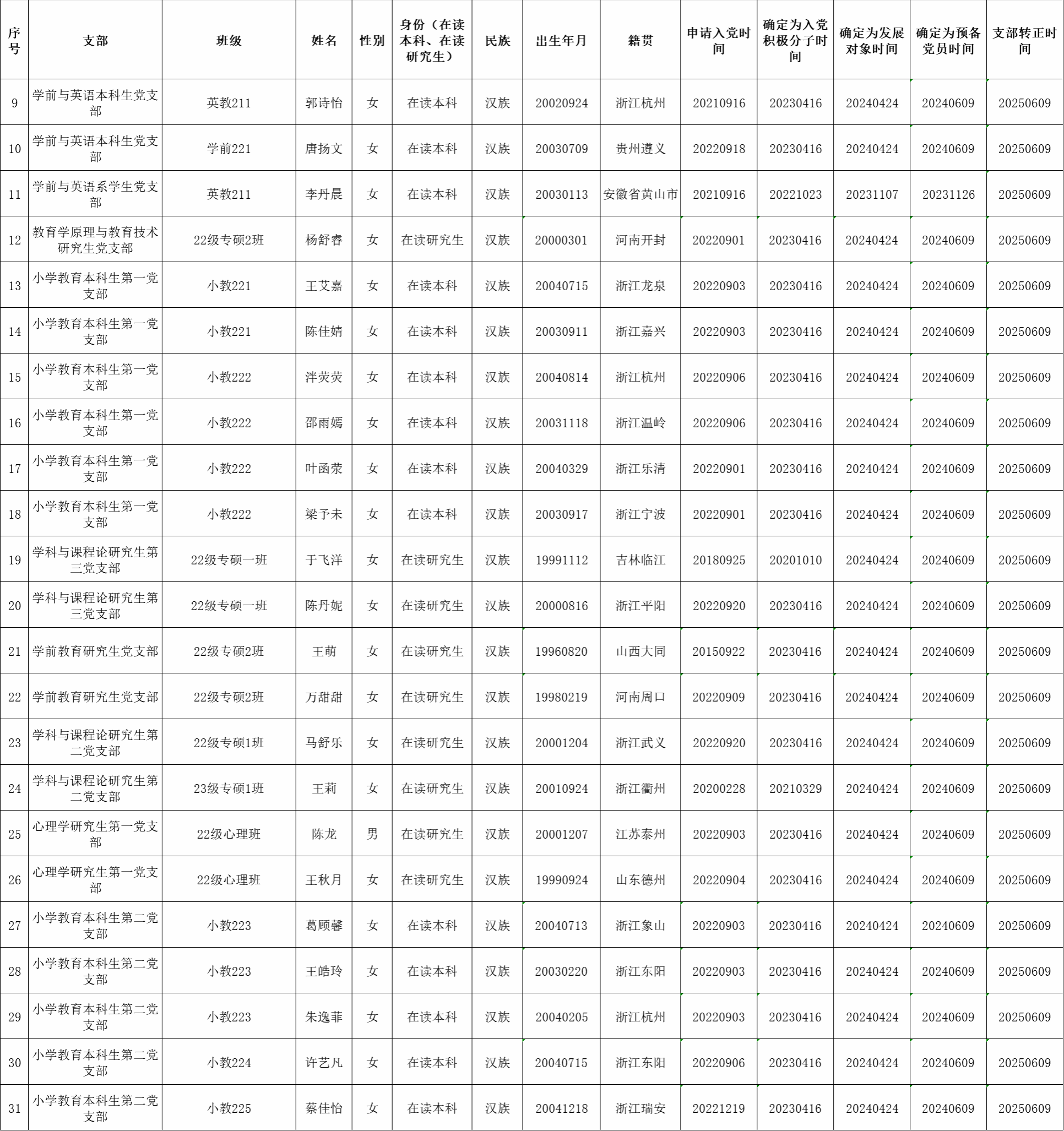 根据《中国共产党发展党员工作细则》中发展党员的文件要求,经对龙奇红等31名同志的预备党员转正条件、转正程序等进行严格审查。2025年6月17日,学院党委会集体审议讨论了龙奇红等31名同志的转正问题。党委委员共7名,实到会7名。经逐个审议和表决,7名党委委员一致认为龙奇红等31名同志已具备正式党员条件,同意批准按期转为中共正式党员,党龄从预备期满转为正式党员算起。具体名单公布如下: