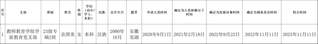根据《中国共产党发展党员工作细则》中发展党员的文件要求,经对佘国美同志的预备党员转正条件、转正程序等进行严格审查。2023年11月14日,学院党委会集体审议讨论了佘国美同志的转正问题。党委委员共7名,实到会7名。经逐个审议和表决,7名党委委员一致认为佘国美同志已具备正式党员条件,同意批准按期转为中共正式党员,党龄从预备期满转为正式党员算起。具体名单公布如下: