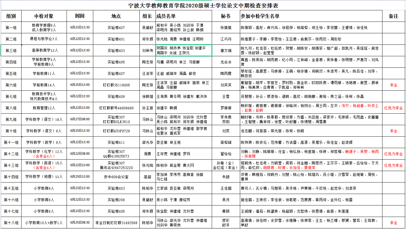 宁波大学教师教育学院2020级硕士学位论文中期检查安排表