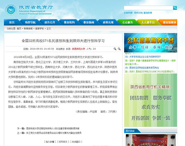 陕西省教育厅网站报道我院迎新工作