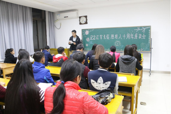 10月27日晚7:00,我院两年制预科七班同学在六附楼201教室举办纪念红军长征胜利八十周年的座谈会。座谈会上,主持人吐力发尔向同学们介绍了本次活动的目的及意义,并提出了一些关于长征的历史问题,同学们都积极回答,各抒己见,课堂气氛十分活跃。最后辅导员总结说:“我们应该将长征精神内化成我们自己的一种力量,它来源于我们内心深处,在我们孤独时,让这种力量带领我们,指引我们,走向胜利,走向前方!”