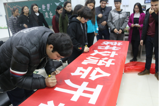 读书交流会开幕仪式秩序井然的进行,主持人以播放幻灯片的方式向在场的同学们详细的介绍了本次读书交流会各负责人的分工情况及活动背景、活动意义、活动目的、活动主题等一系列关于活动的相关内容,读书爱好者们用抽签的方式来分成四个小组进行交流。本次读书交流会别开生面,将分为四期举行。预计第一期交流会中,读书爱好者们将把自己读的书用放幻灯片的方式与大家分享;第二期交流会中,每个小组提前定好主题,书爱好者们讨论主办方提供书、杂志、资料等内容,畅所欲言进行交流学习;第三期交流会将以知识竞赛的方式来举行;第四期交流会以综合性测试的方式来举行。最终,交流会将会为表现出色、活动成绩突出的小组进行总结性表彰并颁发奖状。本科预科班兼职辅导员刘雅丽老师作了发言,表示对本期读书交流会活动有很大的期望,并且鼓励大家在平时学习生活中多读几本好书,从而开阔眼界,增长知识,同时也预祝本次活动能够取得圆满成功。开幕仪式结束后大家纷纷在主题横幅上签上了自己的名字。
