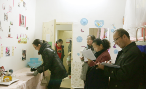 在辅导员热依木老师的带领下,首先来到12-13号男生学生宿舍进行检查。检查过程中,郑生忠书记特意强调要注重学生宿舍的安全问题,并不时的询问宿舍同学关于安全用电、防盗防骗等日常宿舍生活中需要掌握的知识和技能,并对发现的问题给予指正,同时仔细的查看了学生的作息时间安排表,望同学们合理安排时间做到劳逸结合。杨维平老师关切的叮嘱男同学要勤通风,勤晾晒衣服和被子。随后又到2-3号女生宿舍进行检查,2207宿舍的同学还拿出家乡特产请各位老师品尝。各位评委各司其责,对宿舍的洗漱用品的摆放、宿舍制度列表、环境卫生等进行查看。段亚绒老师和同学们还亲切的交谈了学习和生活方面的话题。通过前期的宿舍装扮后,大部分宿舍布置的干净整洁,彰显宿舍文化与民族特色,尤其是宿舍全家福和宿舍文化天地的设计给人留下一种温馨的感觉。从内务整理到宿舍文化定位,从门面装饰到内部设计,特色鲜明的宿舍装饰无不体现了同宿舍不同民族成员之间浓厚的同窗友谊。